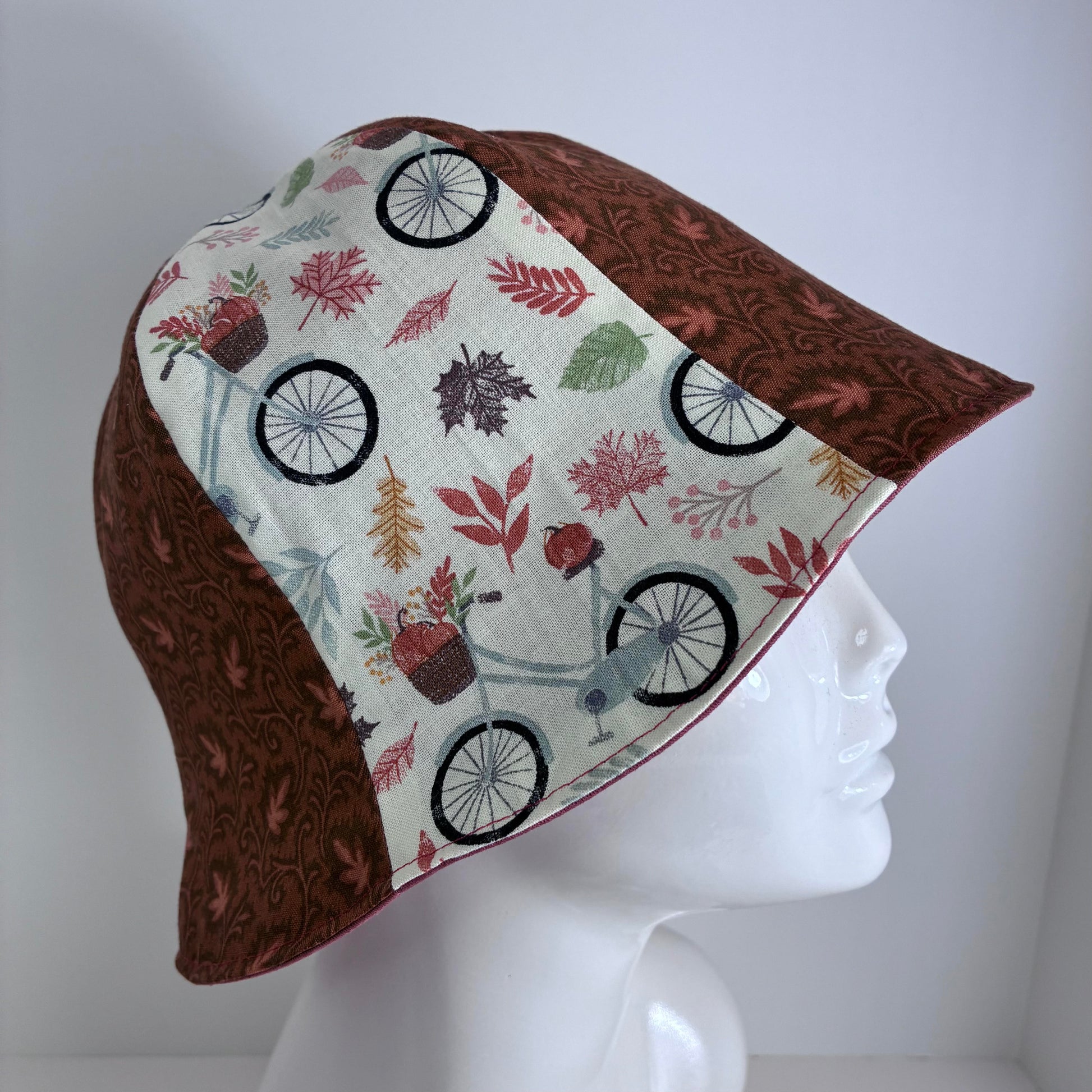Is there a better way to admire the colors of fall than on a bike? This packable reversible hat features panels of fall leaves and bikes on one side and a pumpkin spice colored twill on the other side.