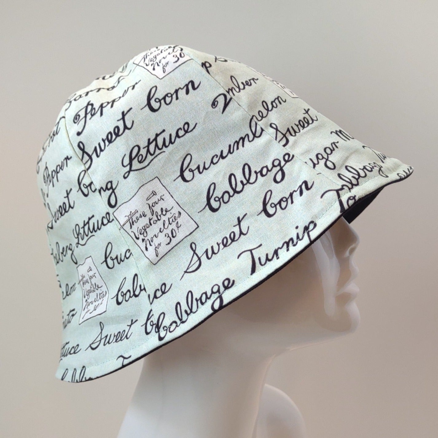 The Black Denim Vegetable Names hat features black denim on one side and the names of vegetables on the other.