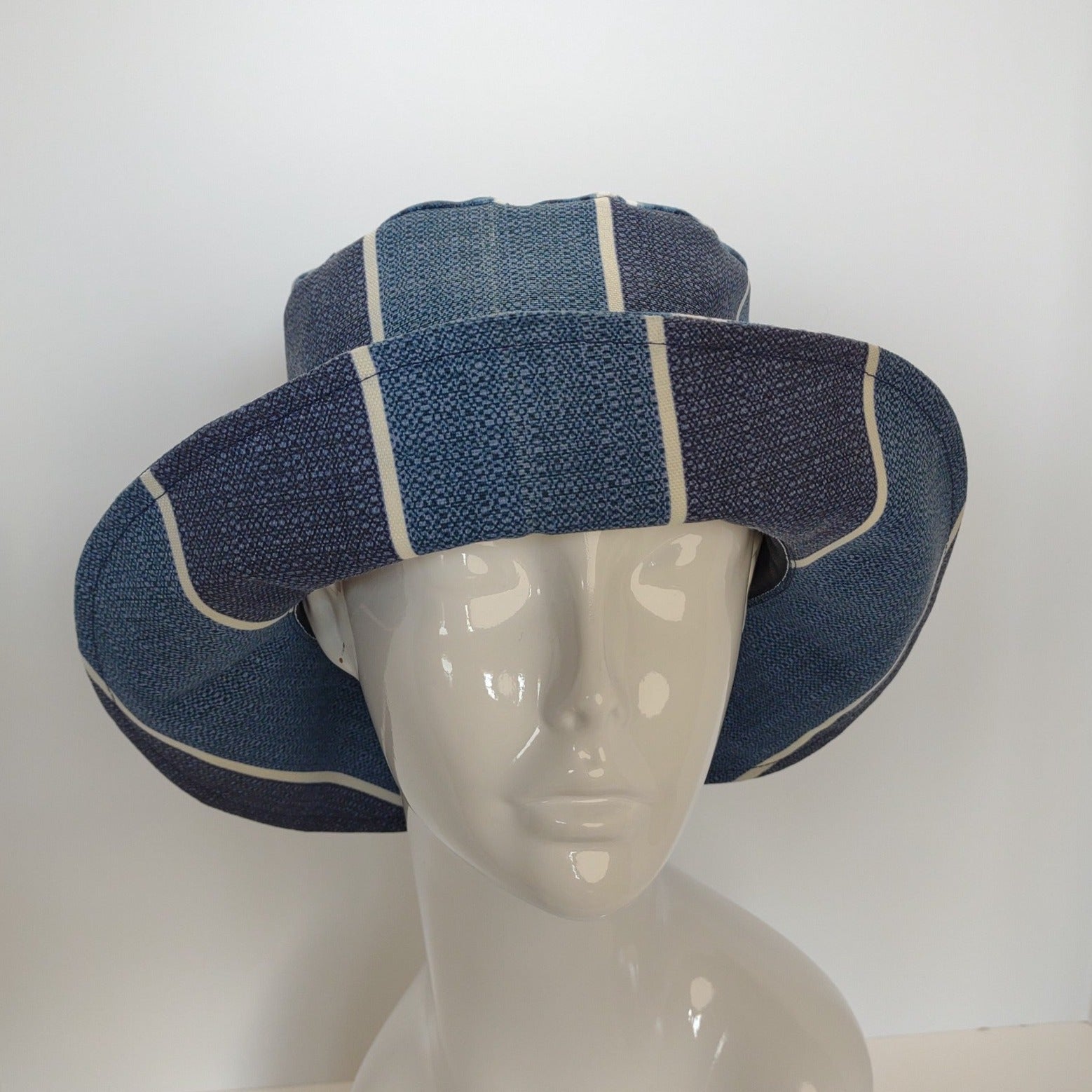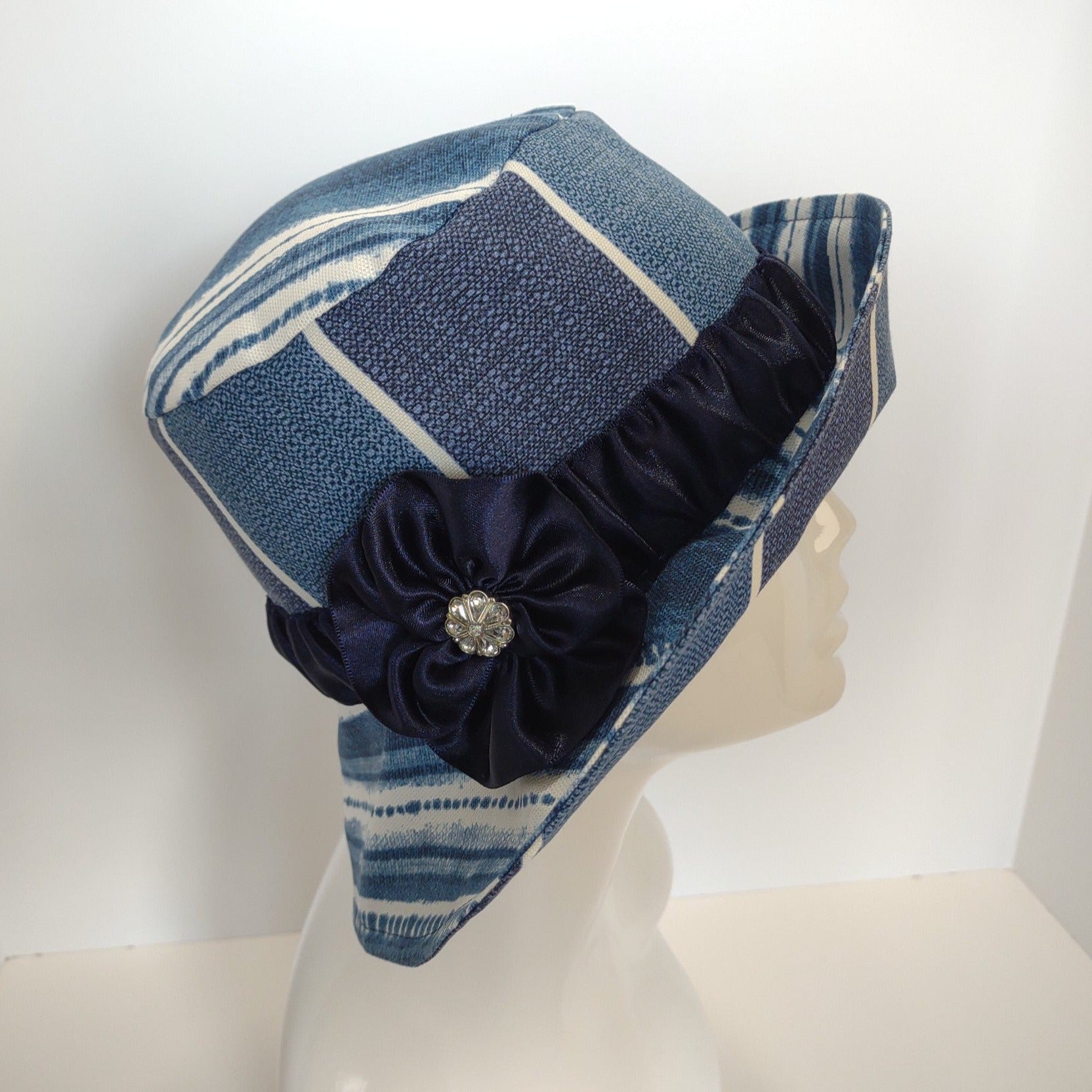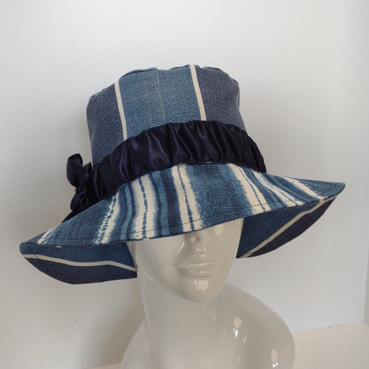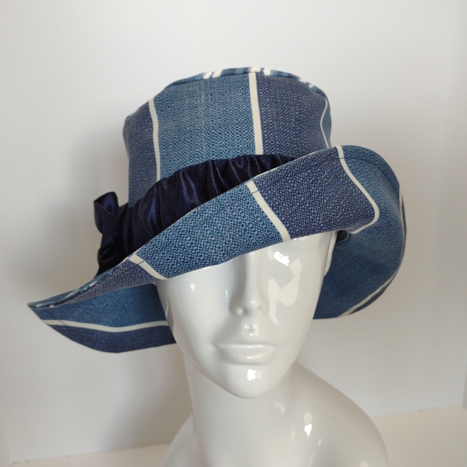 Possibilities abound with this wide-brimmed beauty in shades of blue. Wear the brim down, turn it up on one side, or flip it up in the front, you have options here. Wear this hat with your favorite denim jeans or skirt or dress it up with a navy blue dress and a white or blue jacket.