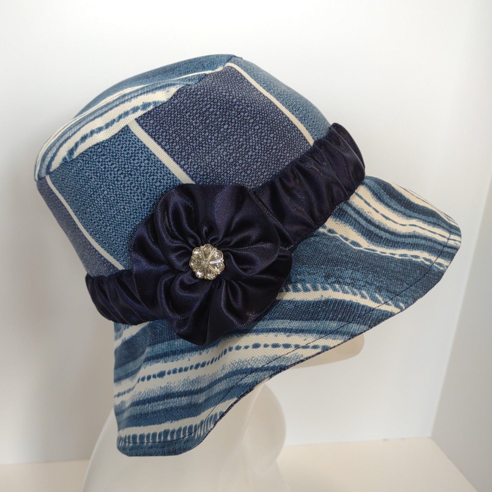 The shell of the hat is cotton canvas, and the inside of the hat sports a navy blue lining and grosgrain sweatband.The outside of the hat is adorned in a gathered ribbon band and ribbon flower, all handcrafted.