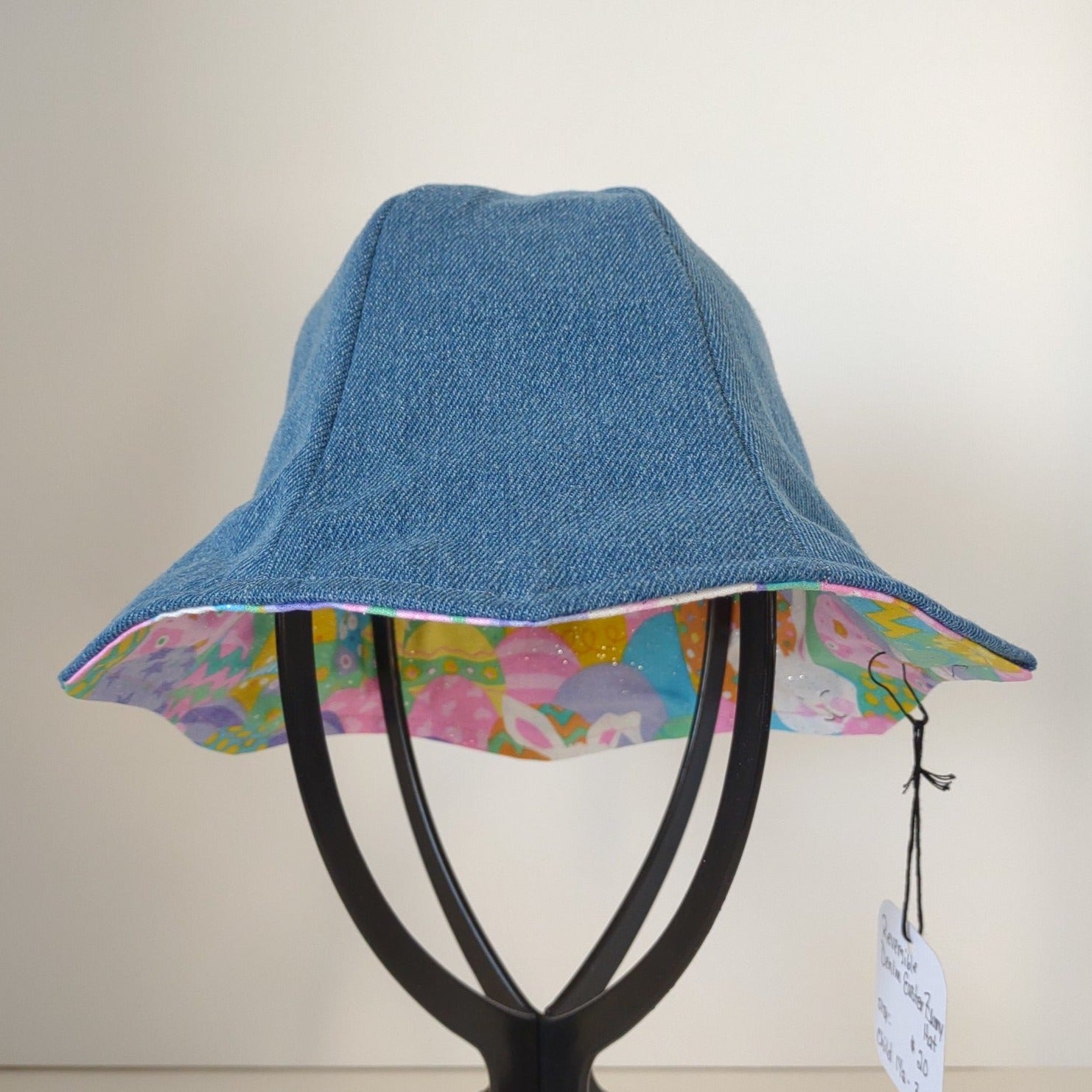 Part of the Hello, Holidays! Collection, this reversible hat features colorful Easter eggs and bunnies on one side and blue denim on the other.