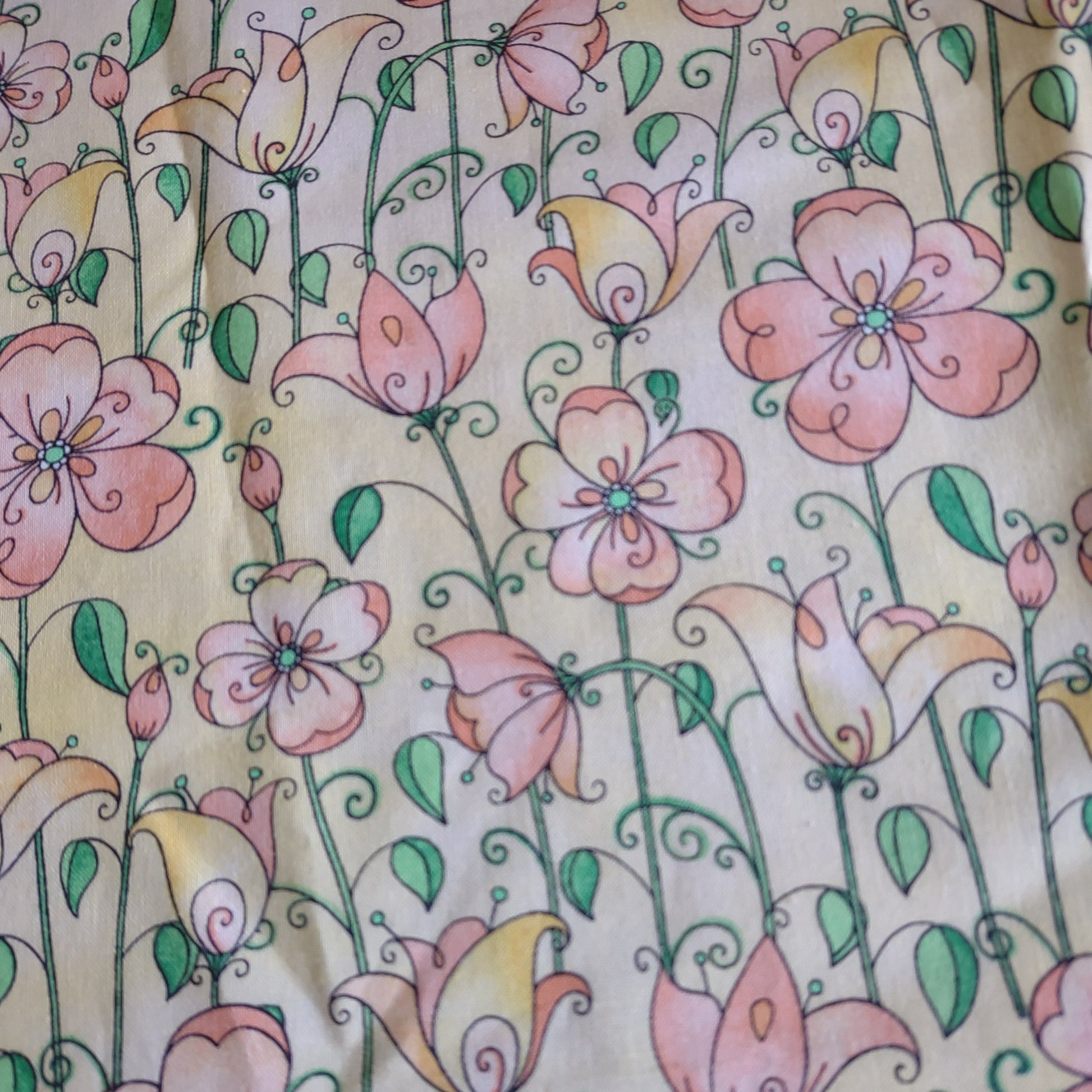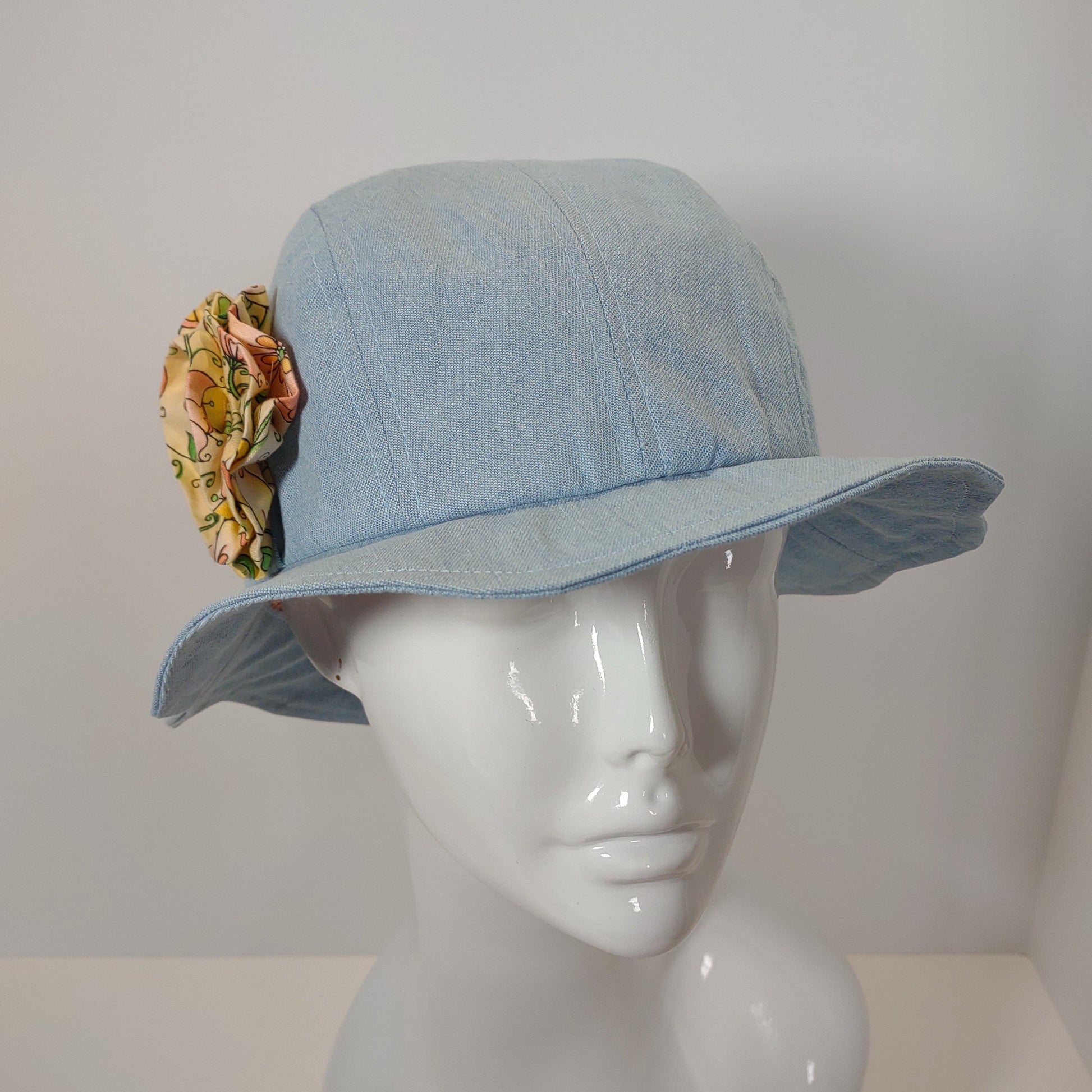 This sky blue denim hat features a scalloped brim and a side flower that matches the lining. The bright and cheerful floral fabric was designed by local Kankakee County artist Natalie Seaton, owner of Moon Cookie Gallery. Hat measures 22 inches.