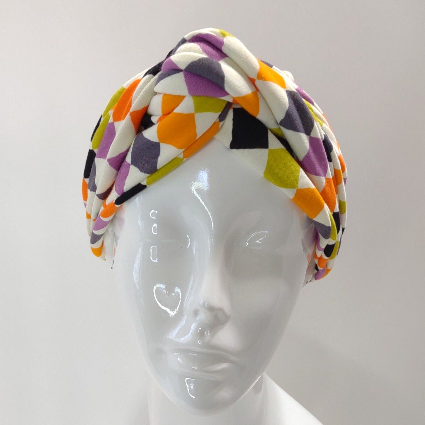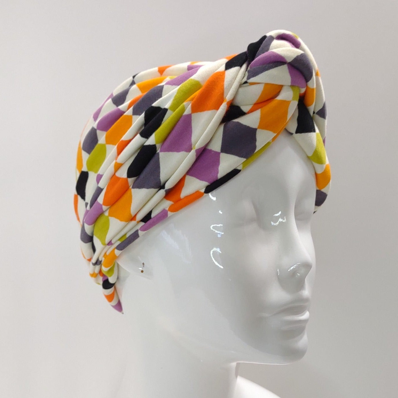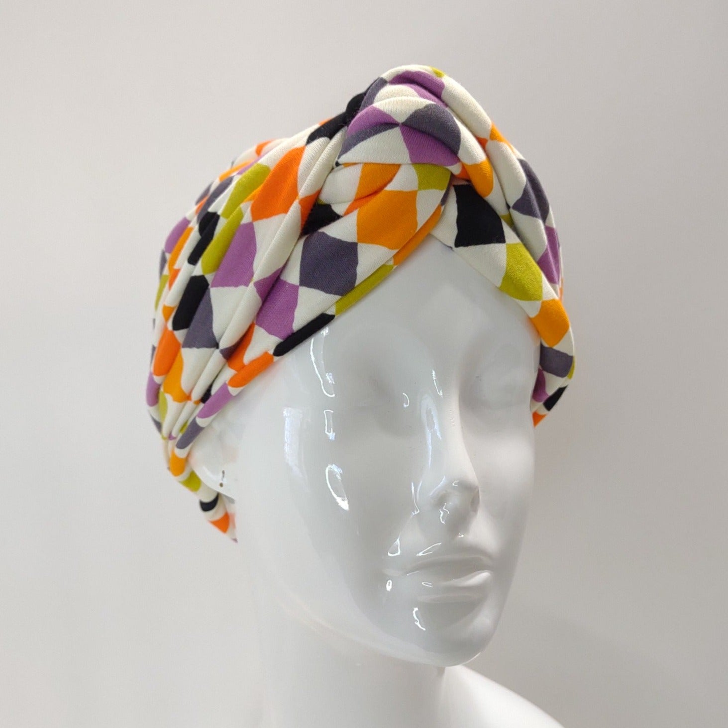 The Diamonds Twisted Knit Turban features multi-colored diamonds in orange, black, purple, gray, and green.
