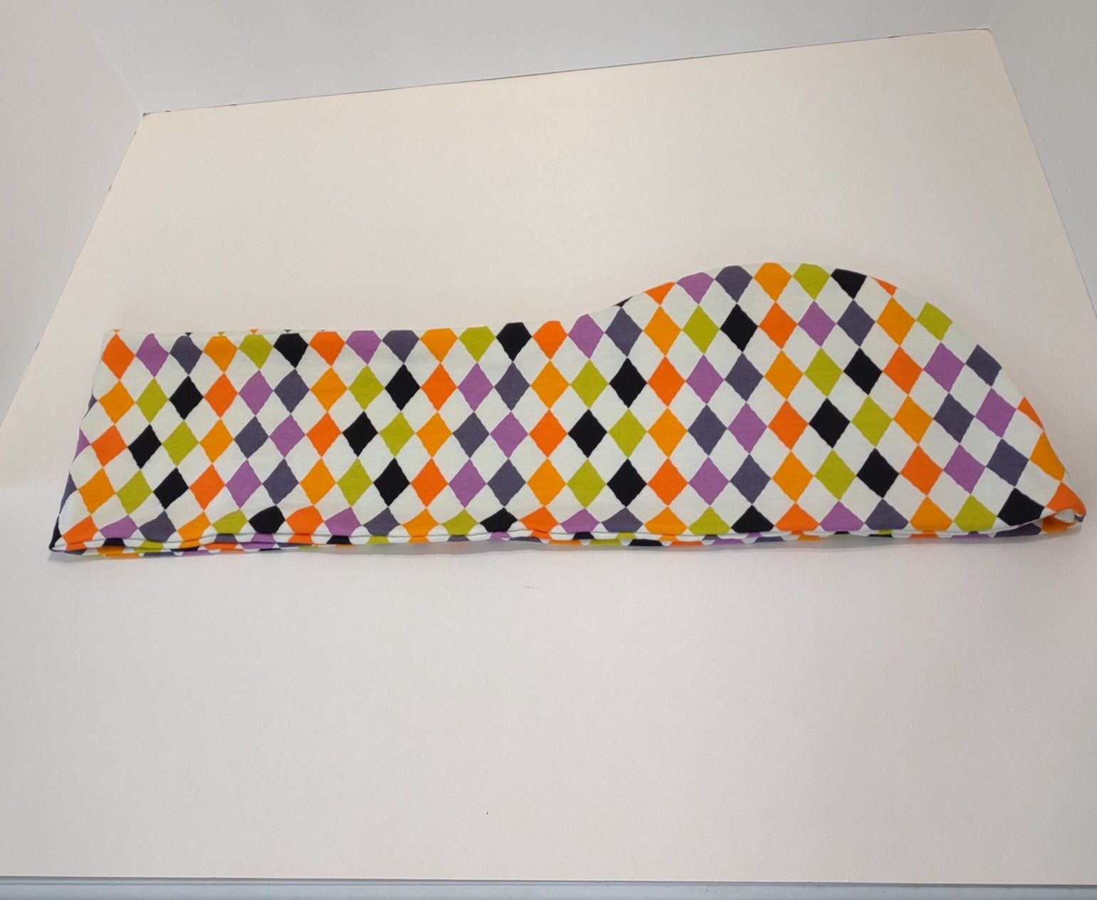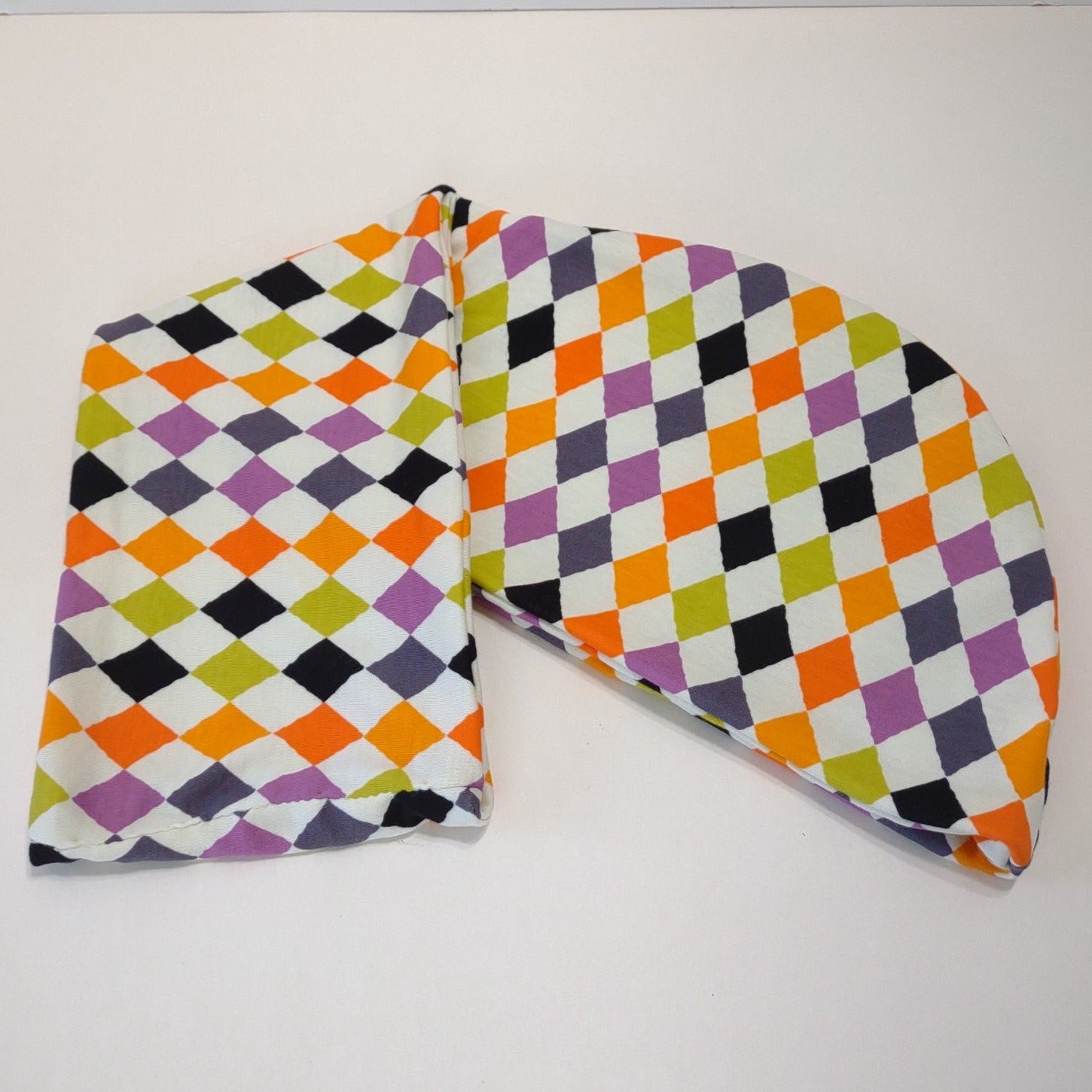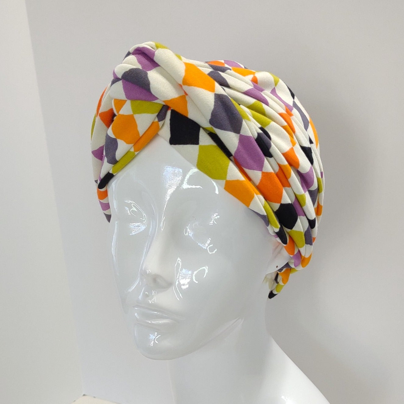 The Diamonds Twisted Knit Turban features multi-colored diamonds in orange, black, purple, gray, and green.