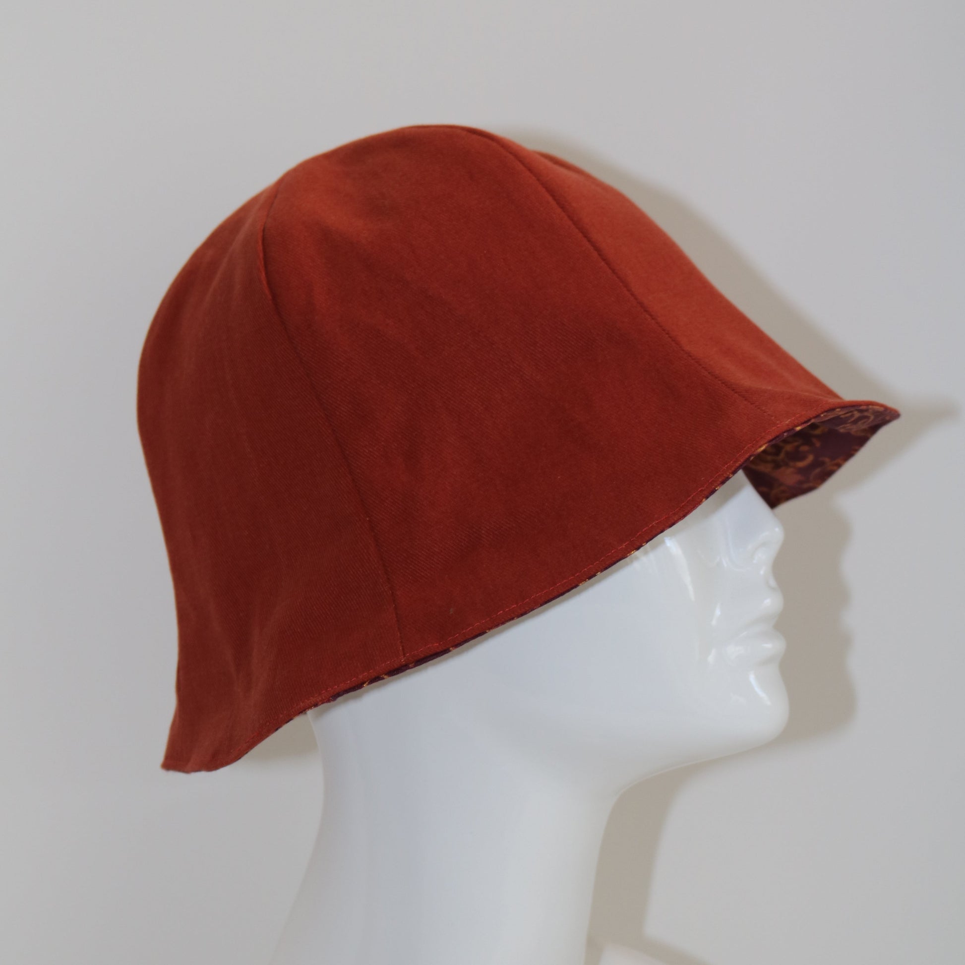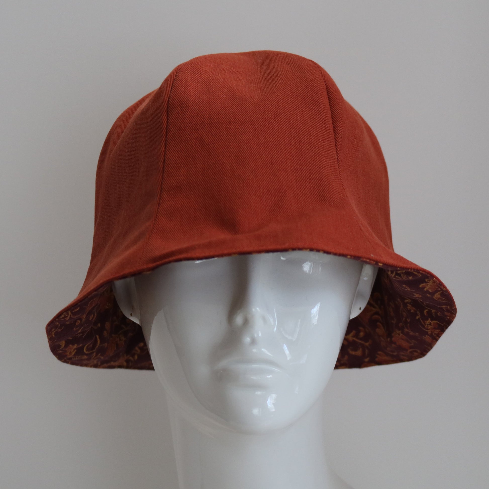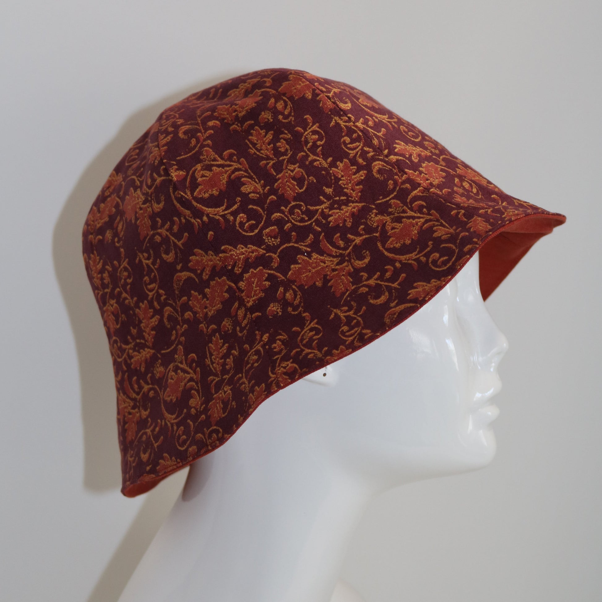 This versatile hat features a rust/burnt orange denim on one side and golden leaf motif cotton fabric on the other side. This packable hat is a perfect choice for your adventures. From the fall markets to the pumpkin patch, this hat embraces autumn in all of its glory.