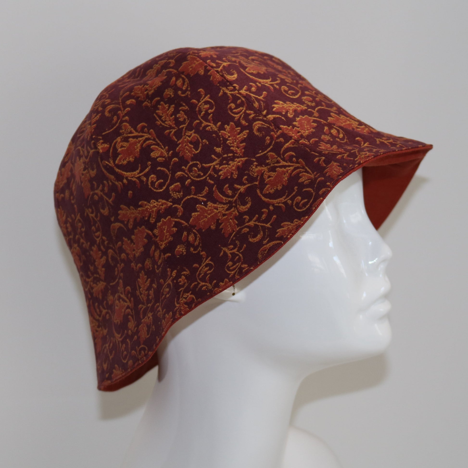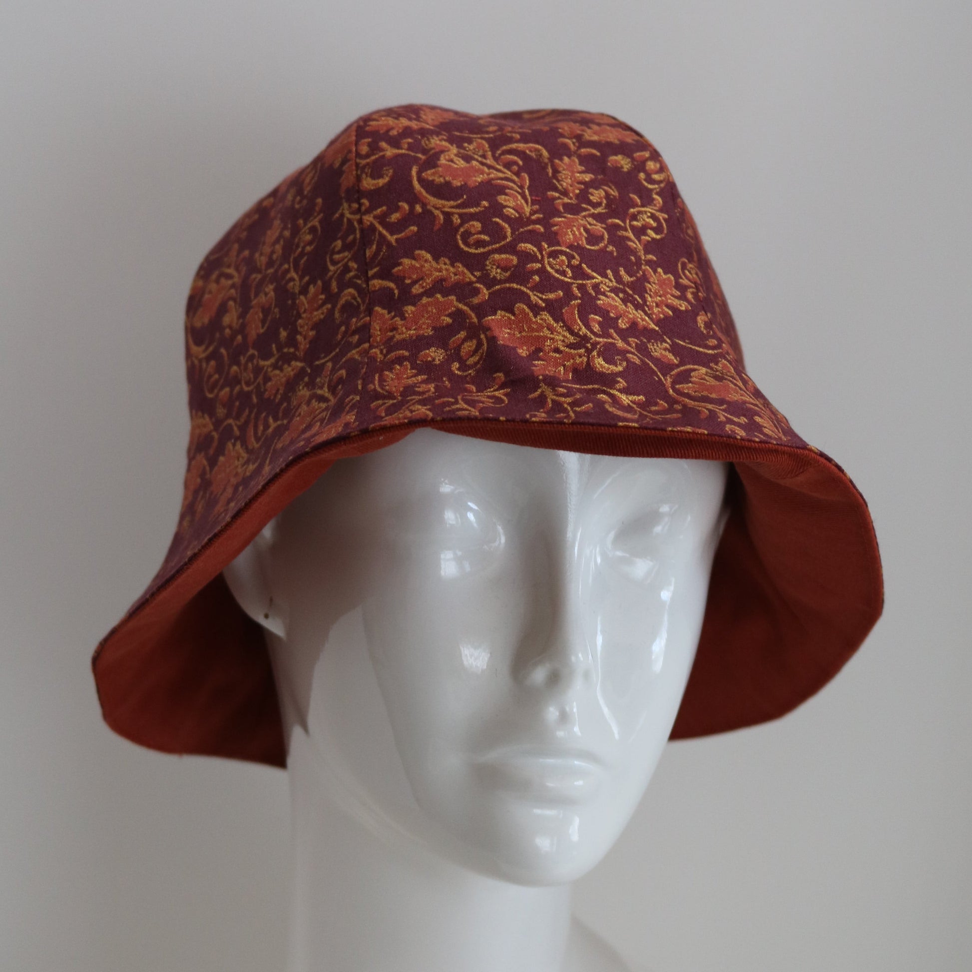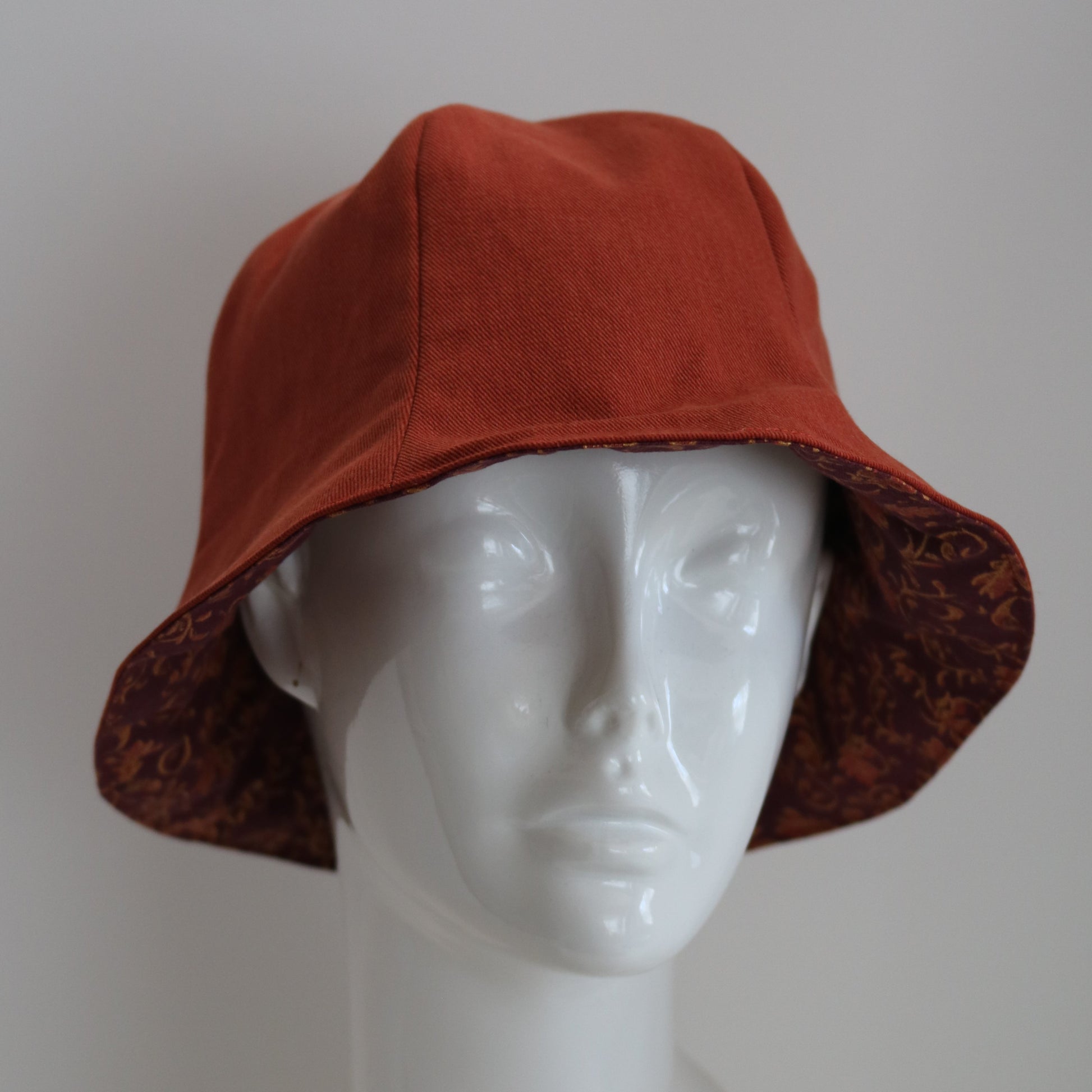 This versatile hat features a rust/burnt orange denim on one side and golden leaf motif cotton fabric on the other side. This packable hat is a perfect choice for your adventures. From the fall markets to the pumpkin patch, this hat embraces autumn in all of its glory.