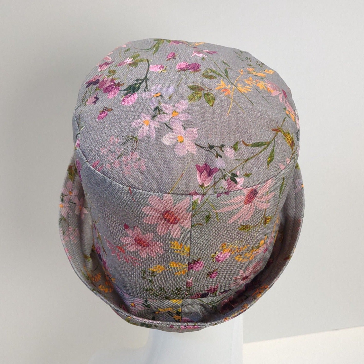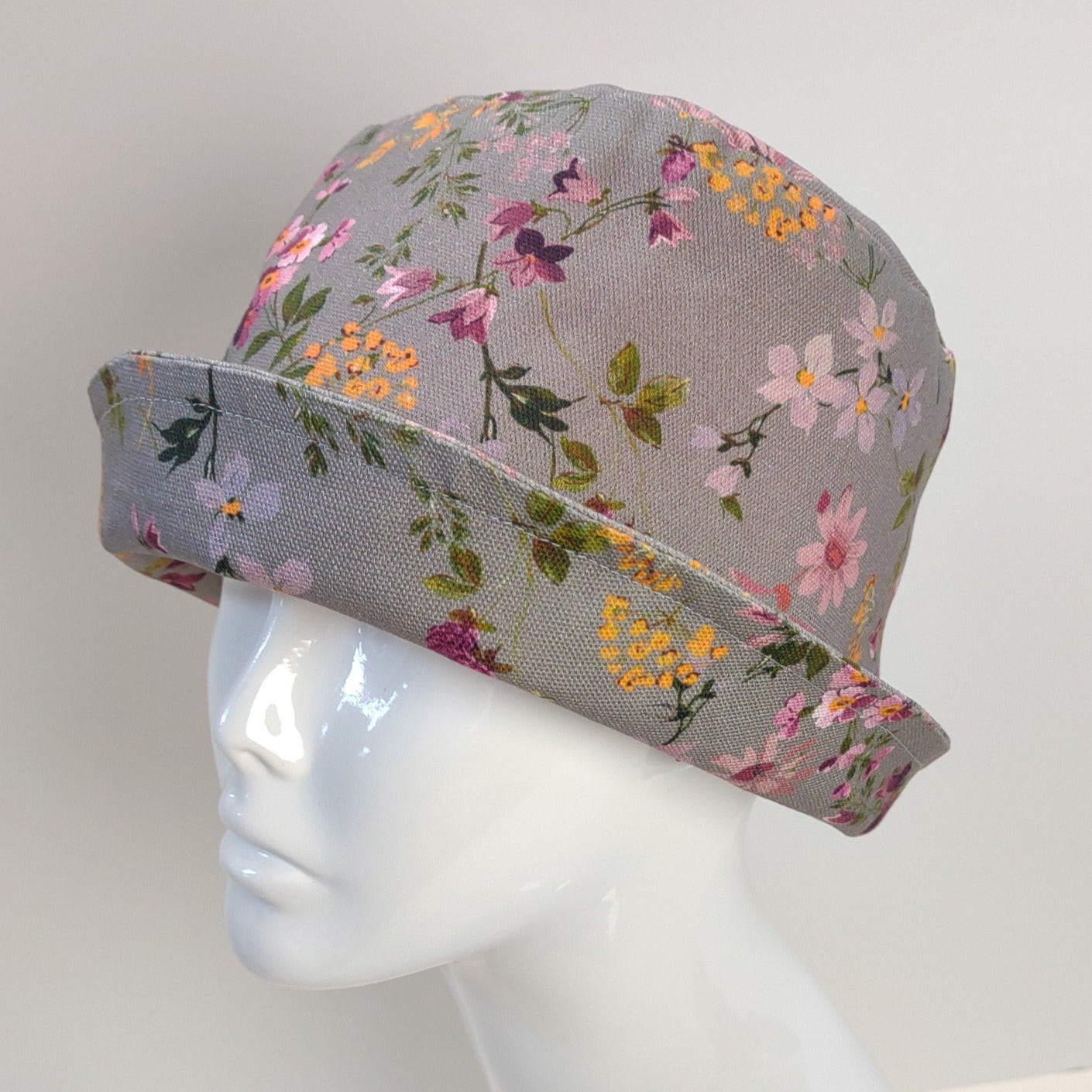This cotton canvas rolled cuff hat features a lovely floral pattern in shades of pink, purple, gold, and green and is lined in premium pink cotton.