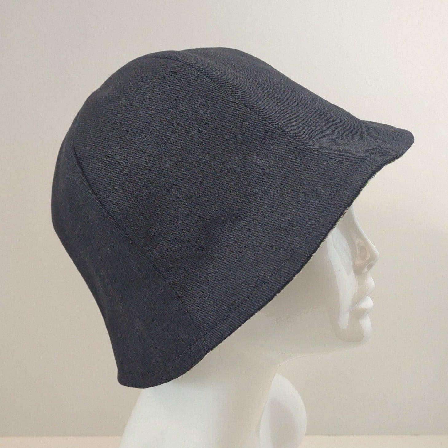 This reversible hat features a green and black plaid on one side and black denim on the other side.