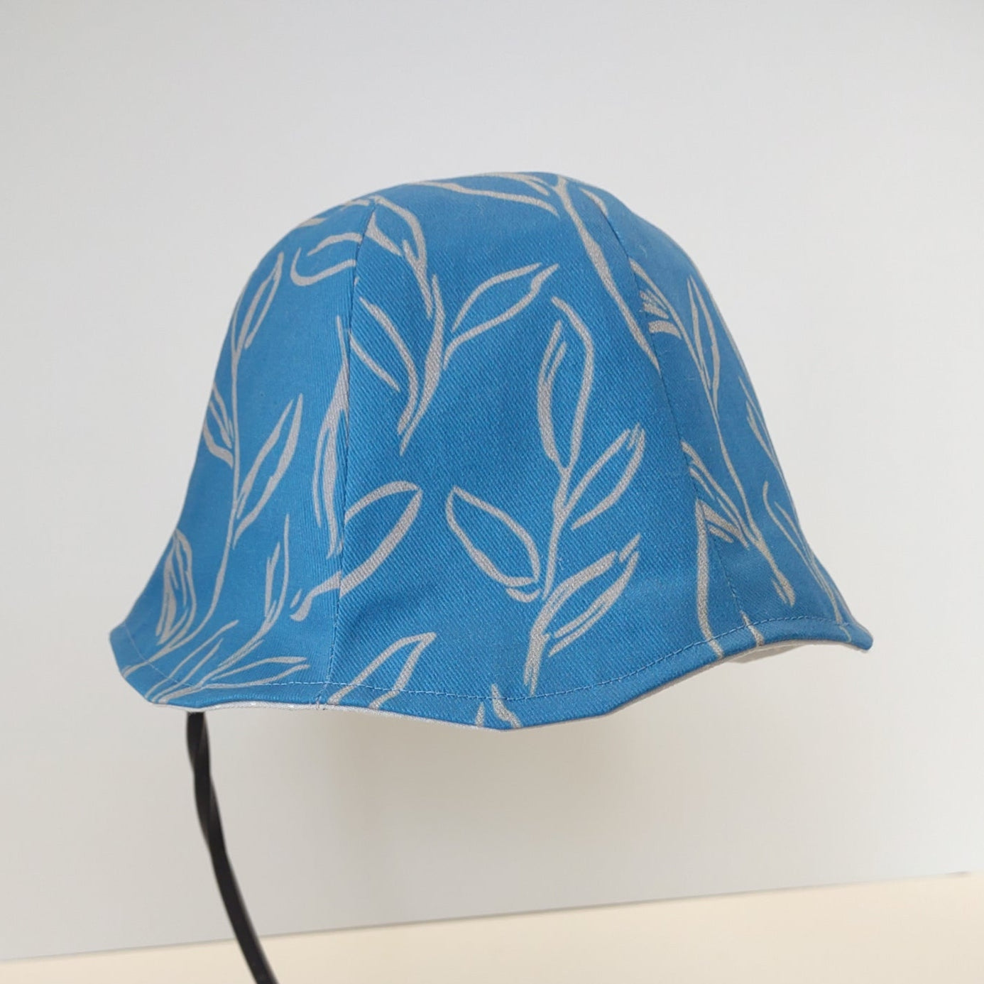 This leaf motif originated in my sketchbook and is part of my own custom-designed fabric collection. The colorway features gray leaves on a jewel-tone blue background. This reversible hat features a subtle dotted gray cotton fabric on the other side.