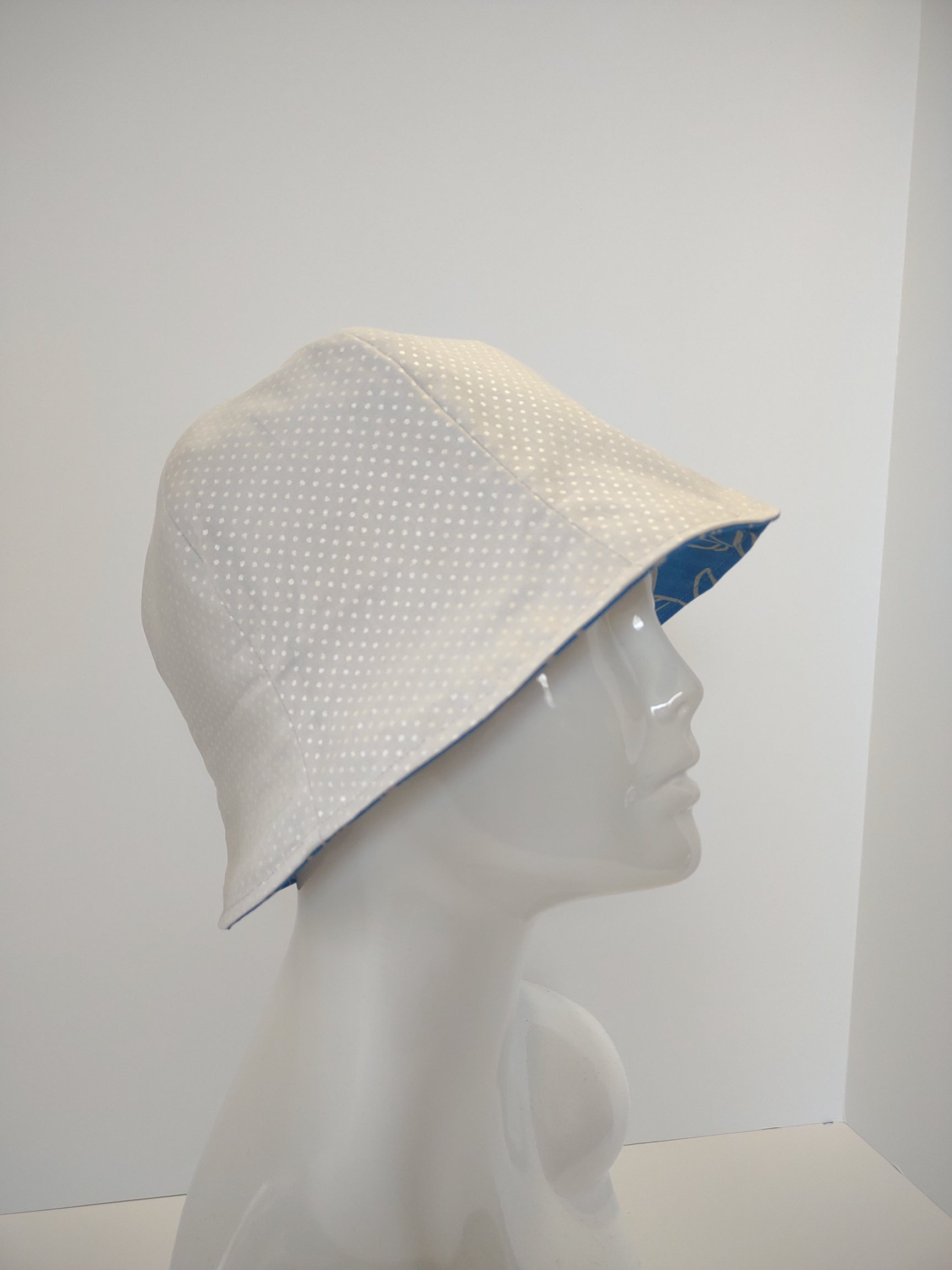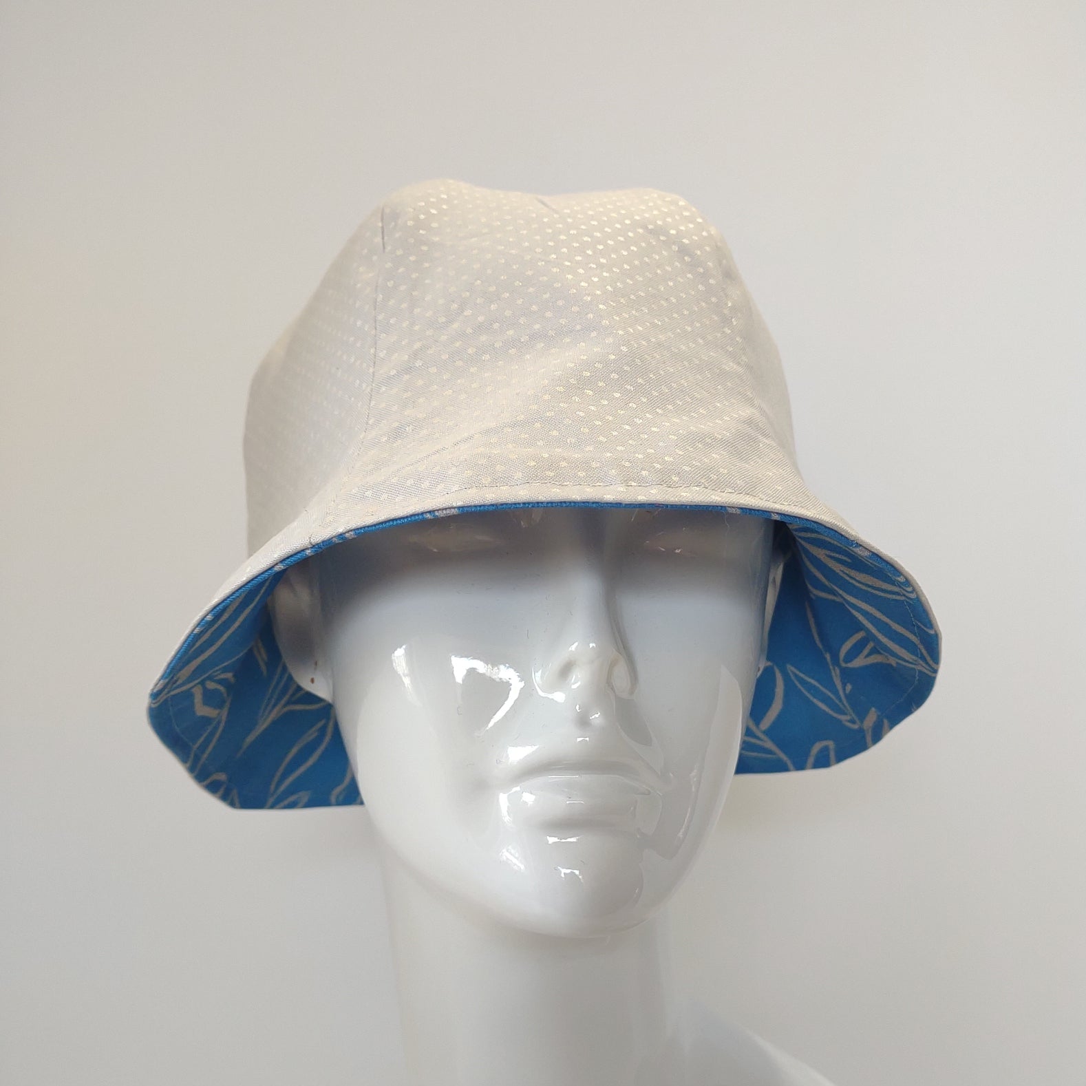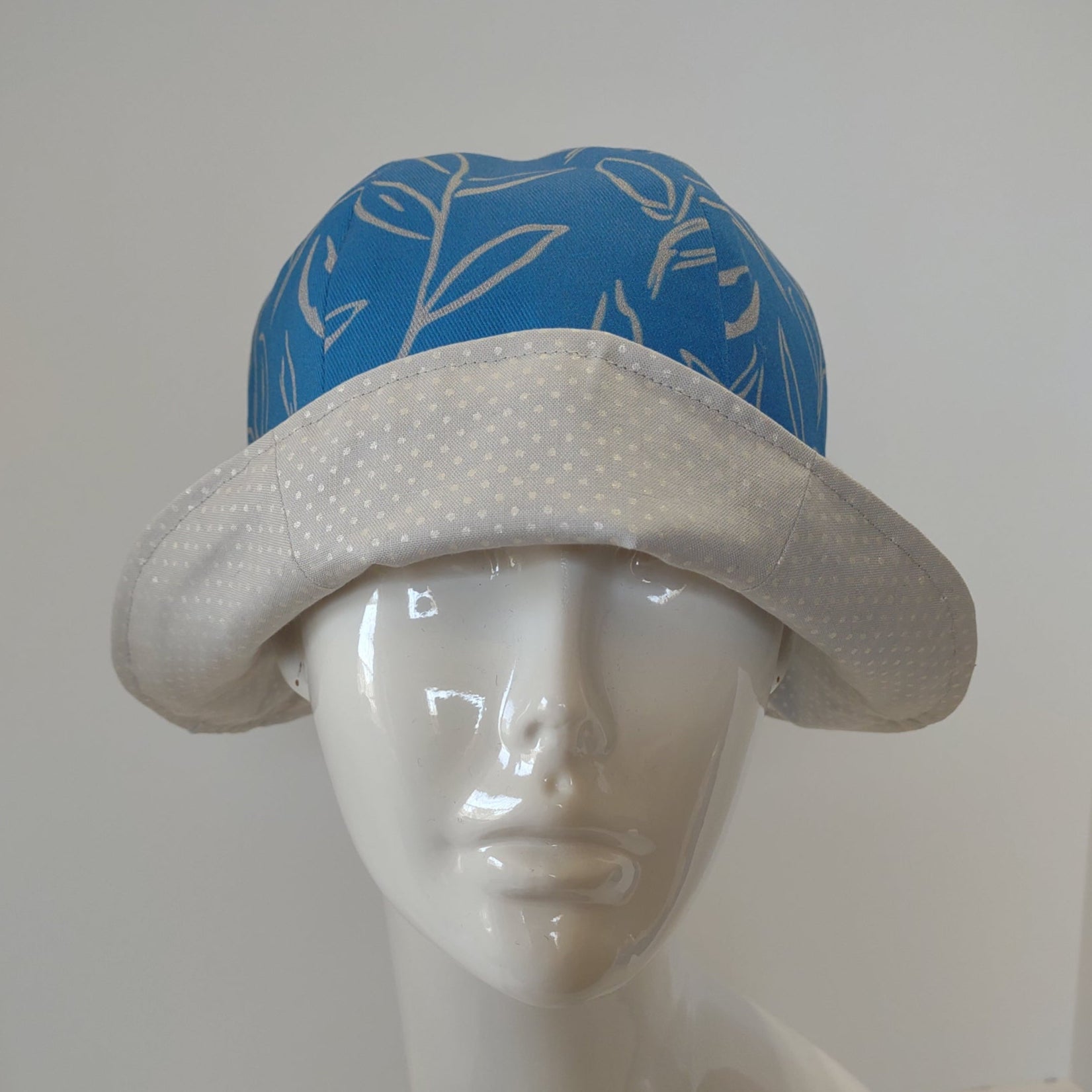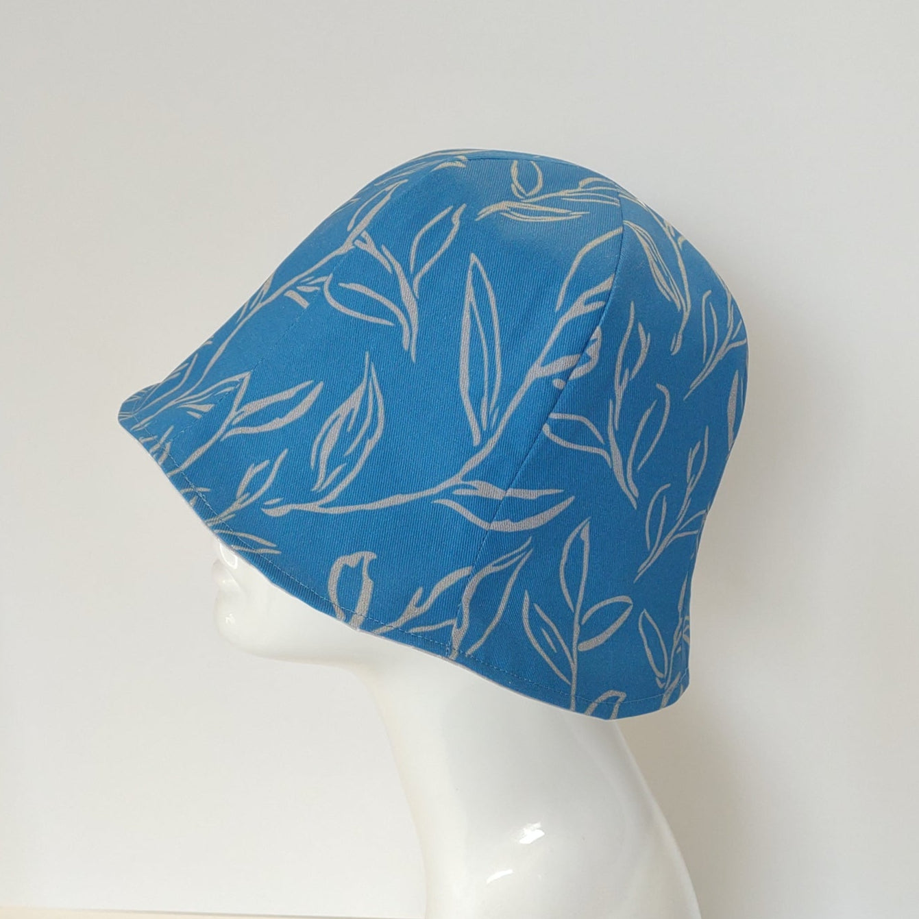 This leaf motif originated in my sketchbook and is part of my own custom-designed fabric collection. The colorway features gray leaves on a jewel-tone blue background. This reversible hat features a subtle dotted gray cotton fabric on the other side making it wondrously versatile. Lightweight and packable, this twill hat is perfect for travel, hiking, outdoor festivals.
