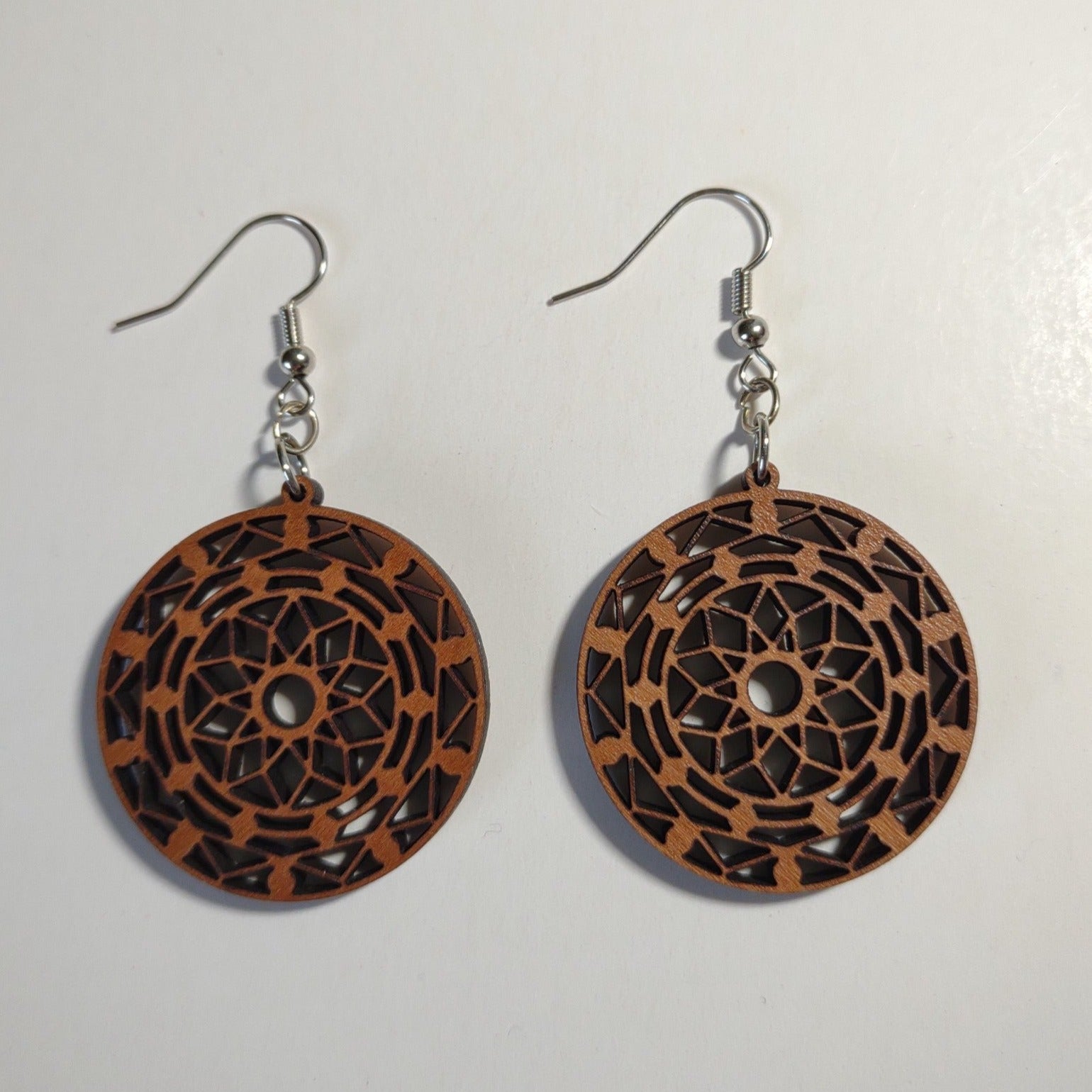 These round woodcut earrings feature a craftsman motif and measure 1 1/4 inches from top to bottom of woodcut.