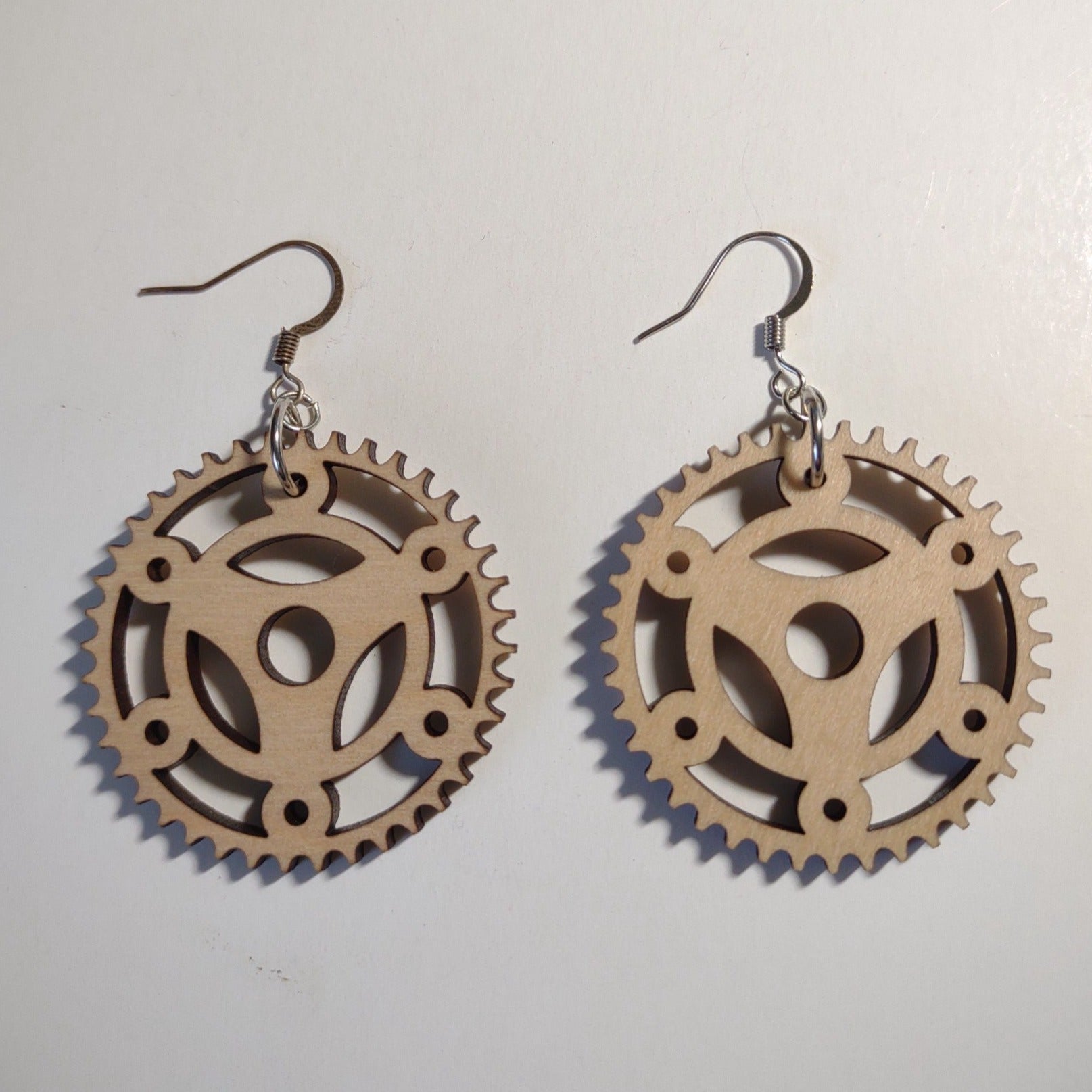 These handcrafted woodcut earrings feature a chainring motif in a natural finish and measure 1 1/2 inches from top to bottom of woodcut.