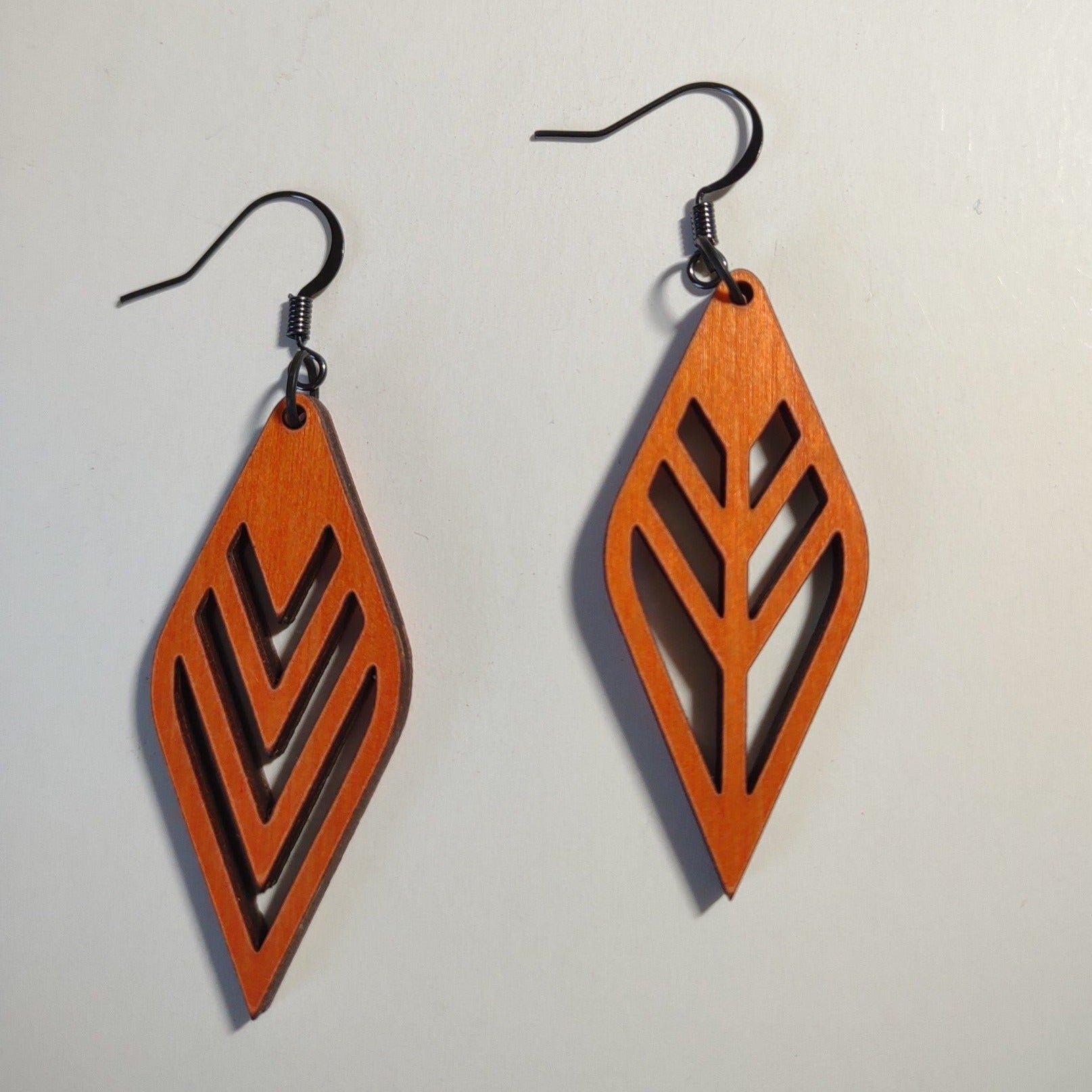These handcrafted woodcut earrings feature complementary abstract motifs on each earring and measure 1 3/4 inches from top to bottom of the woodcut.