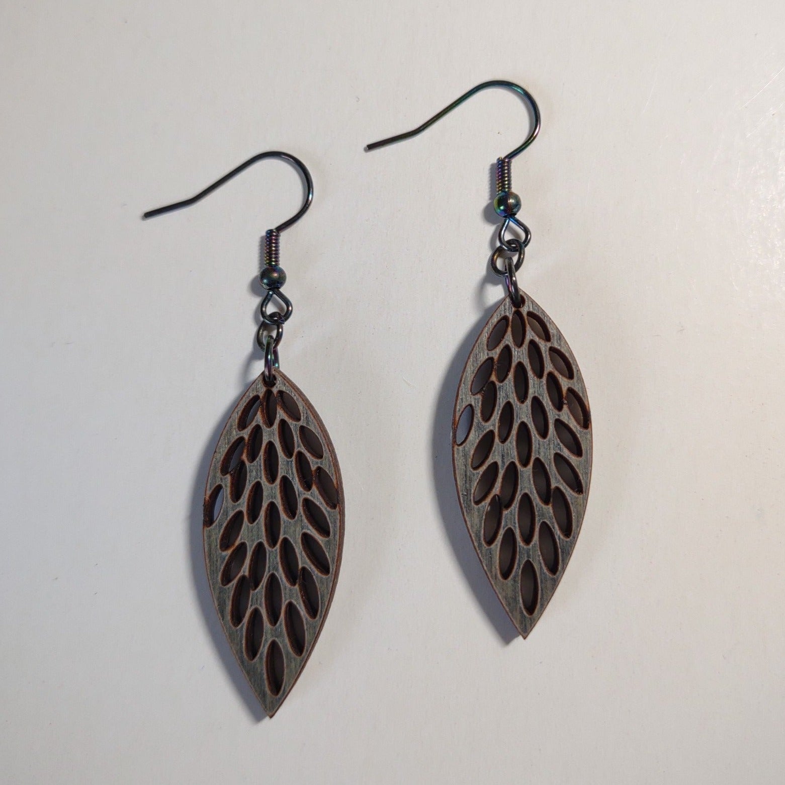 These handcrafted woodcut earrings feature a leaf design with a gray finish and measure 1 1/2 inches from top to bottom of woodcut.