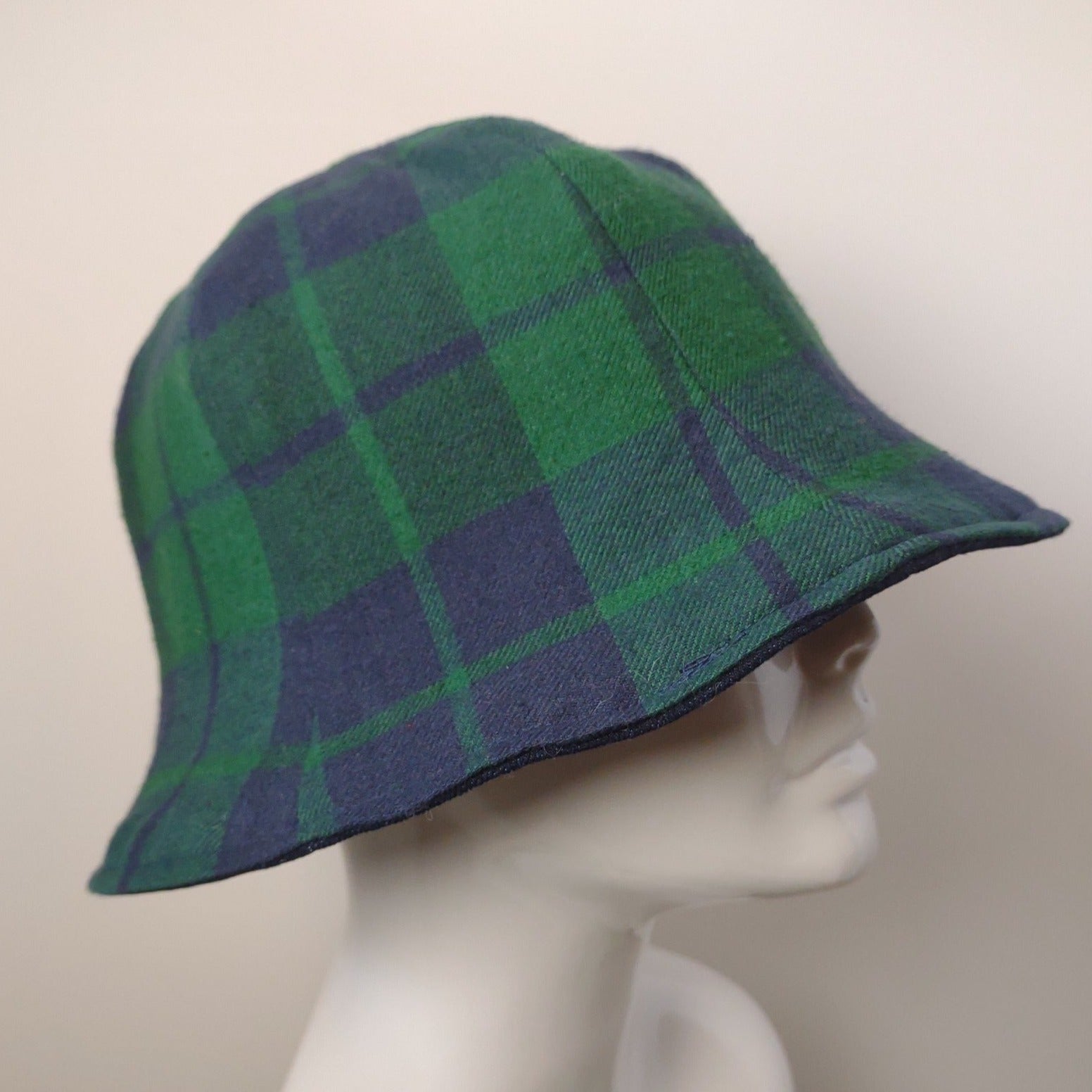 This reversible tulip hat features a navy and green plaid flannel on one side and a dark midnight blue denim on the other side. This hat is a great travel option as it packs flat.