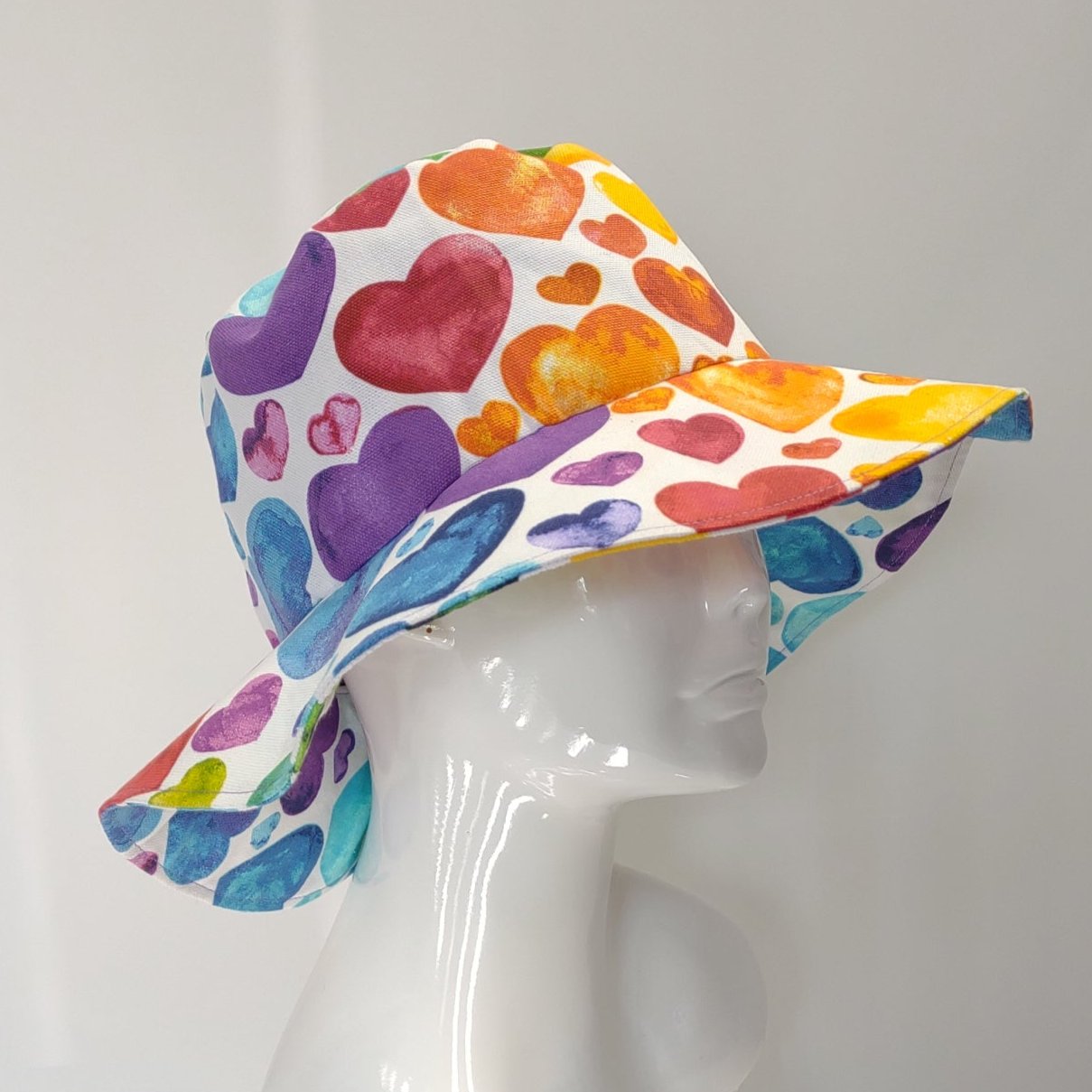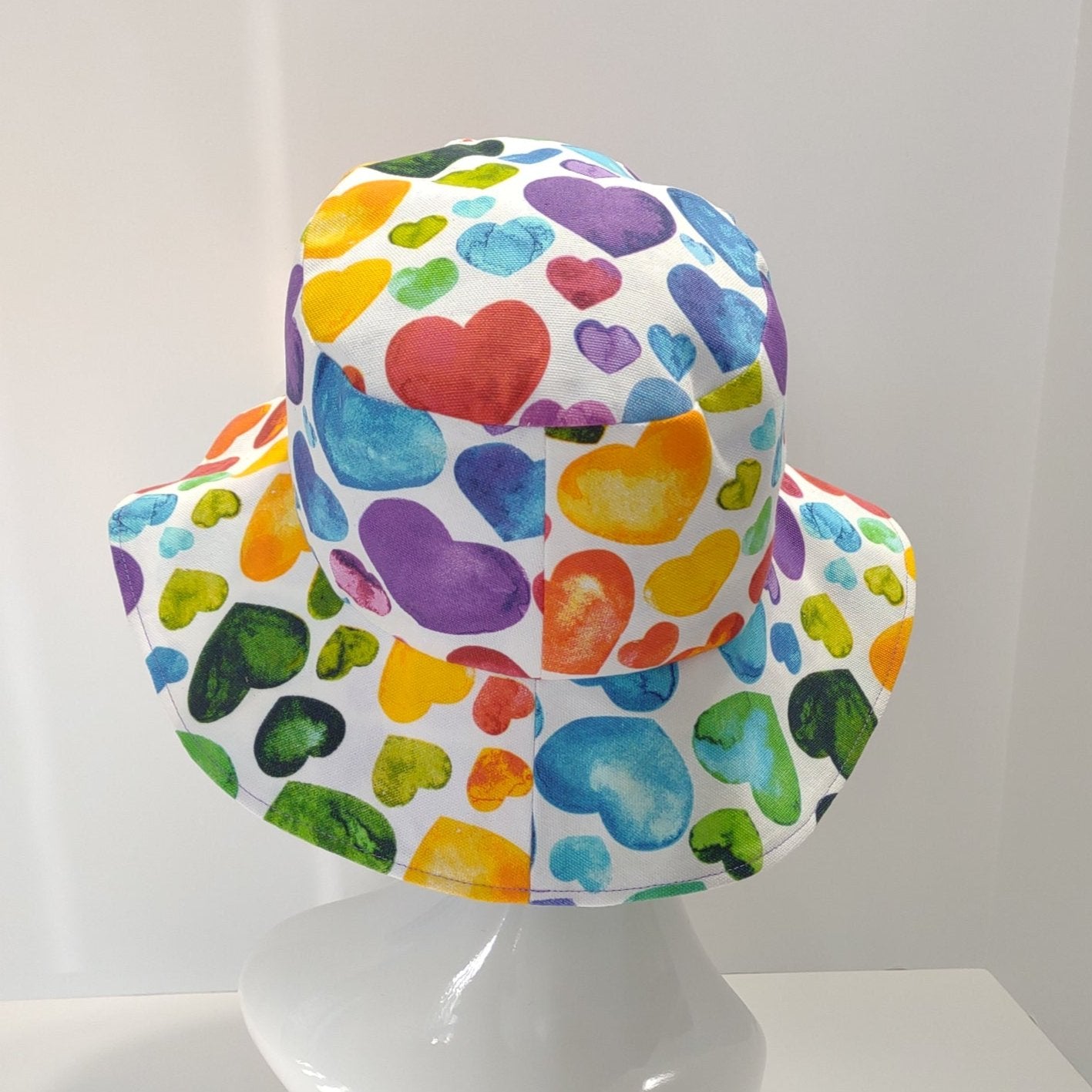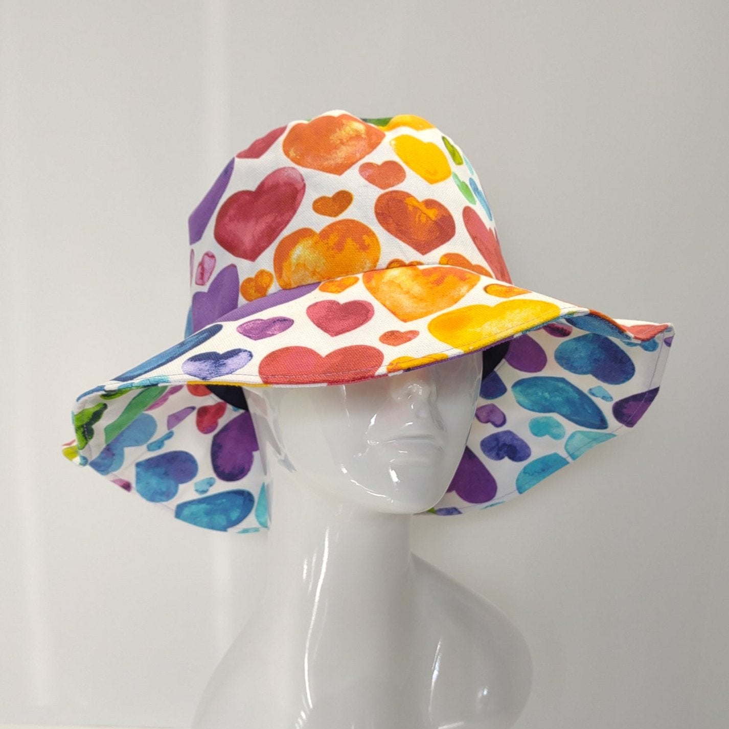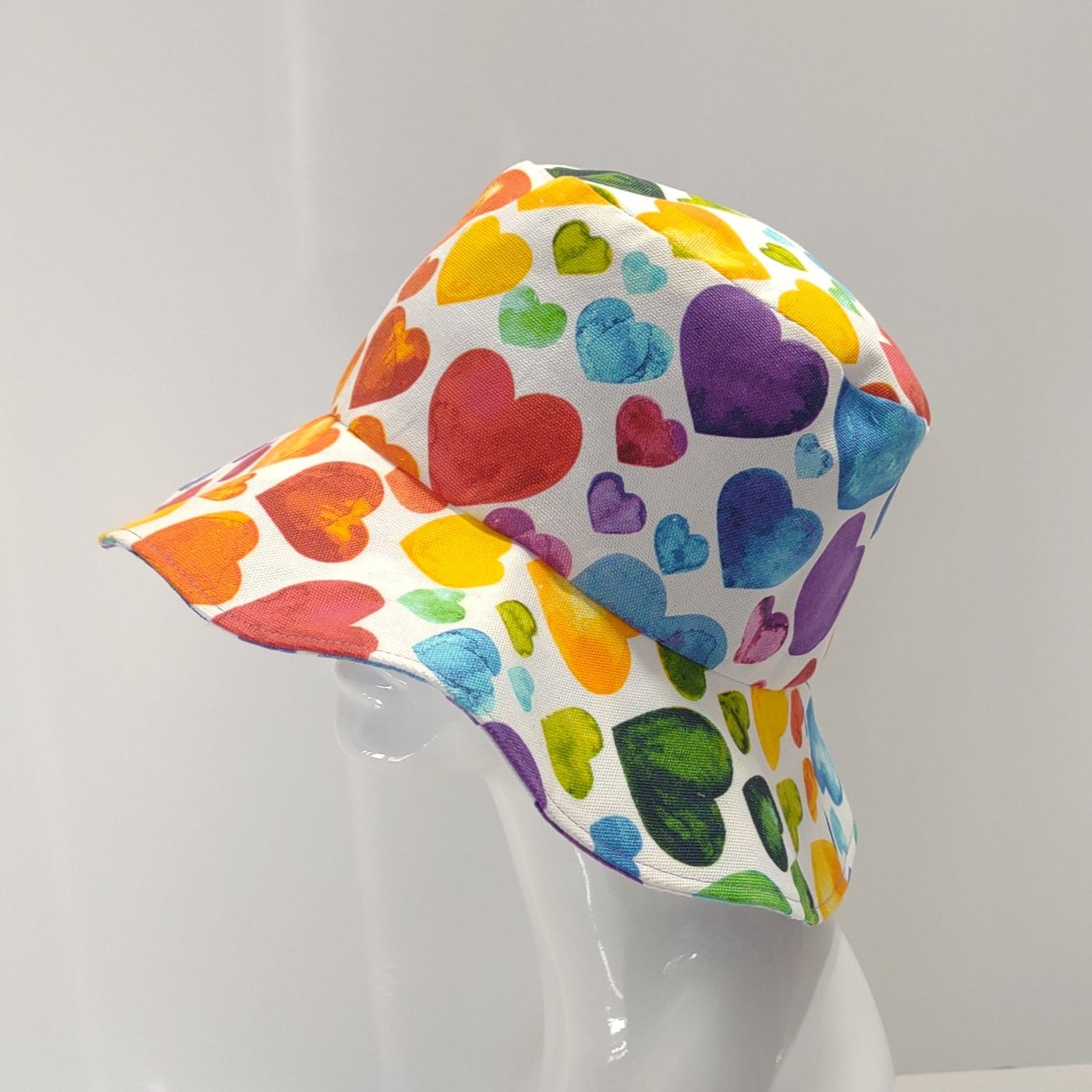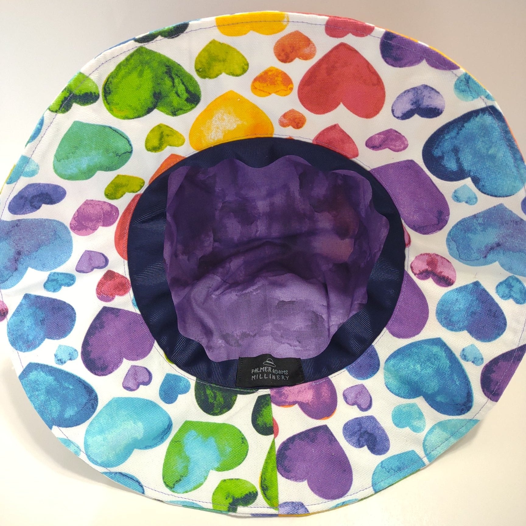 The Pride Hearts Brimmed Hat features a floppy brim and a bright display of multi-colored hearts and is lined in a coordinating watercolor purple cotton fabric.