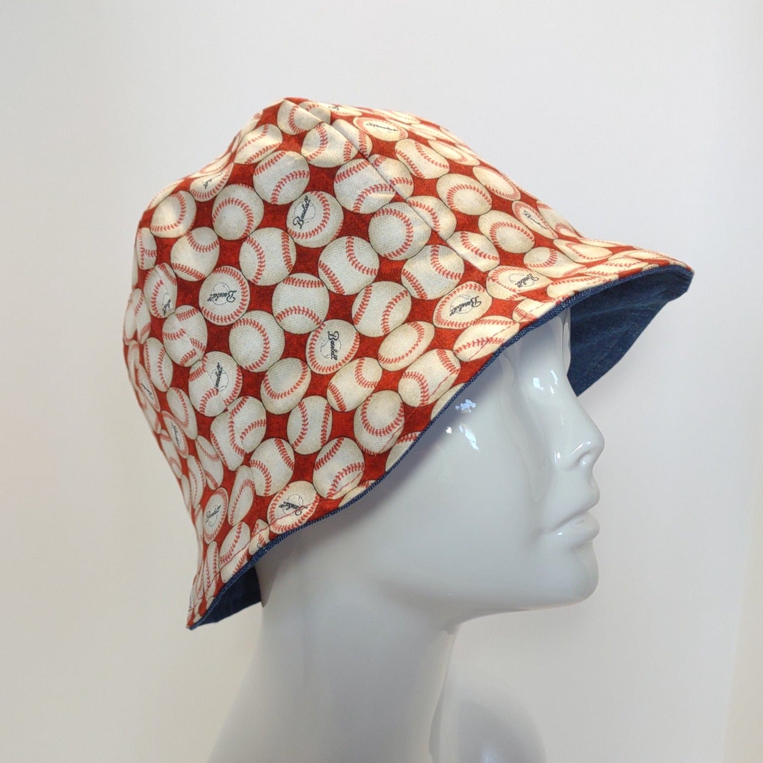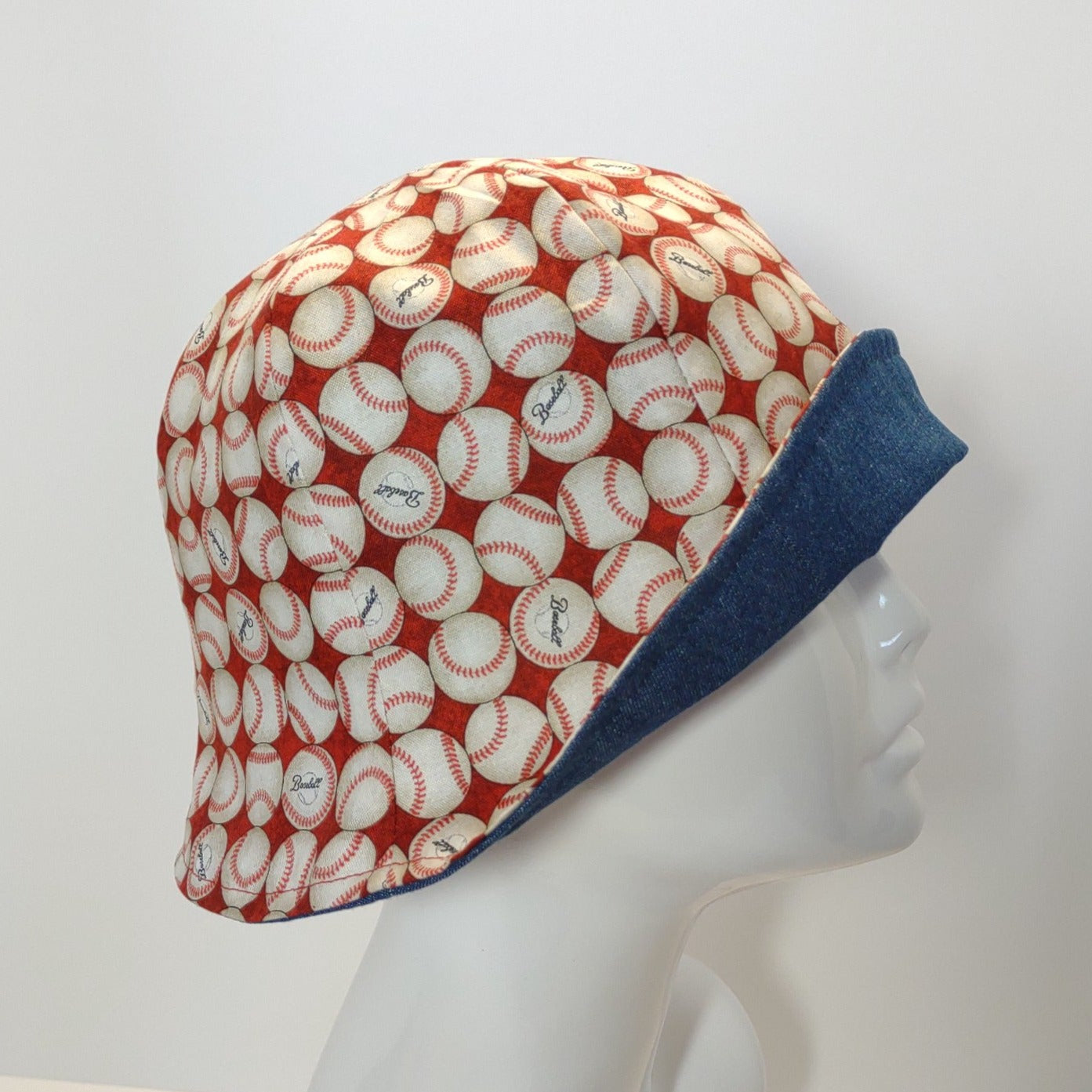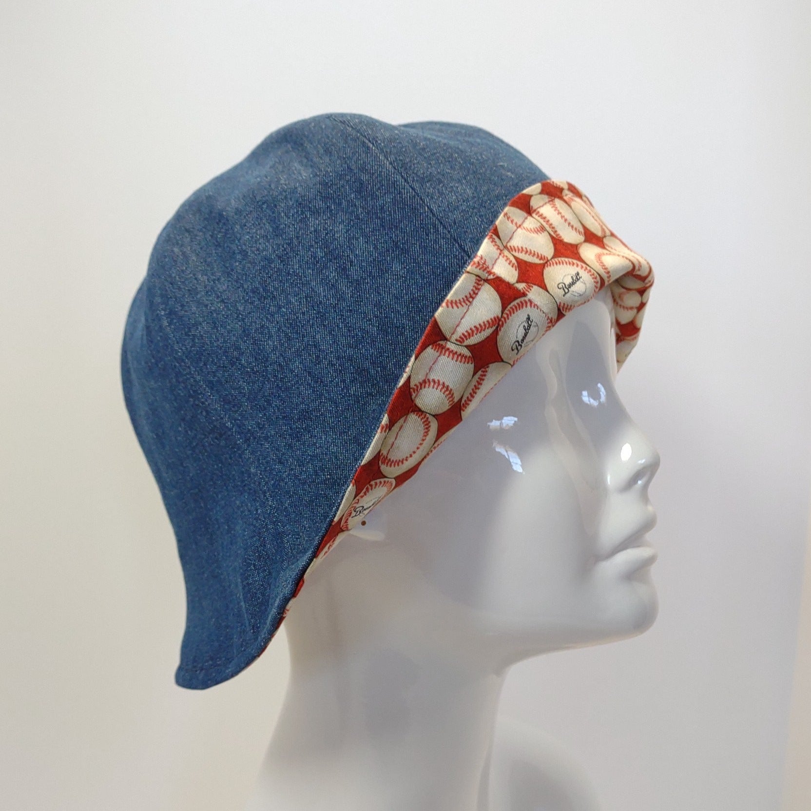 Wear what you love. This reversible tulip hat features denim on one side and baseballs on the other.