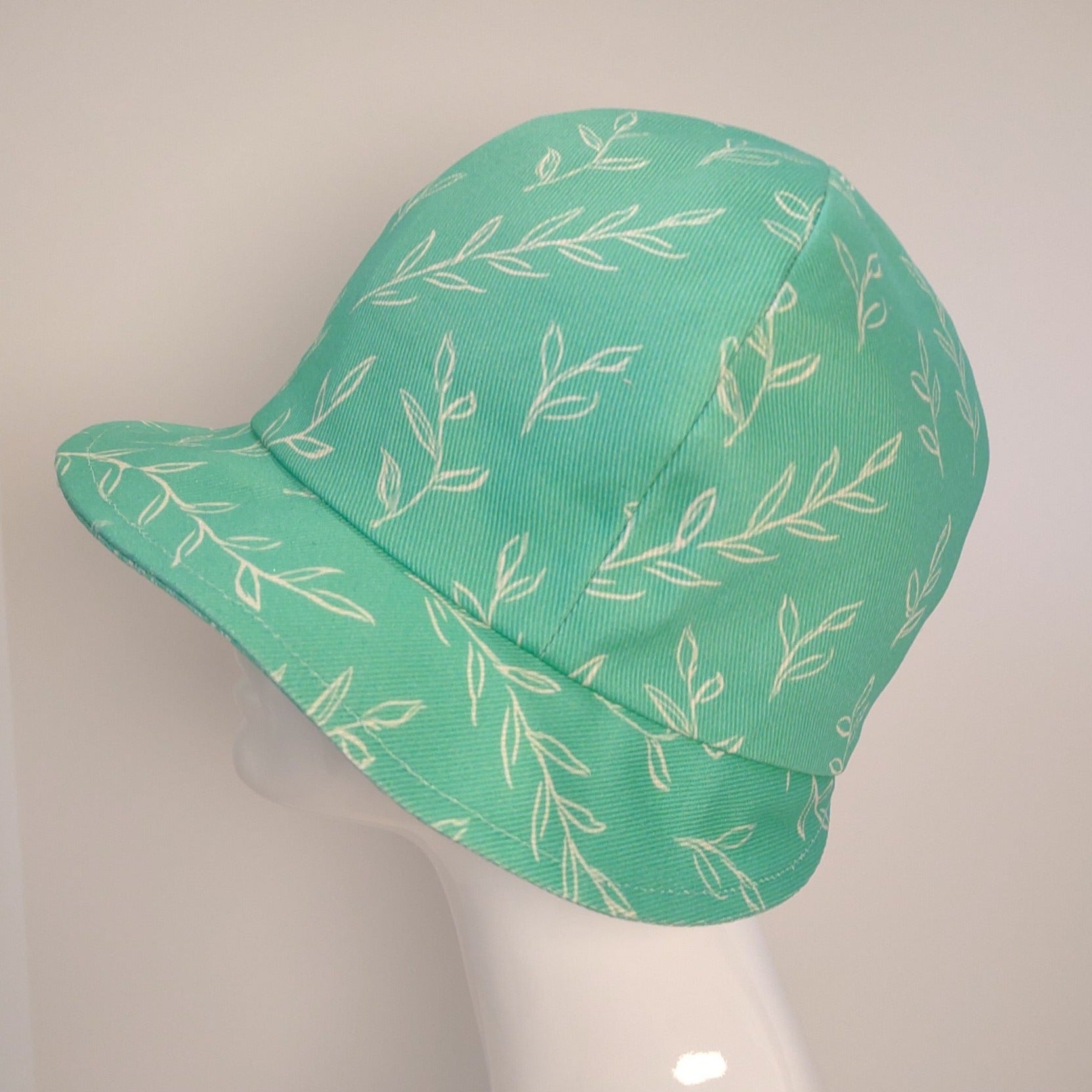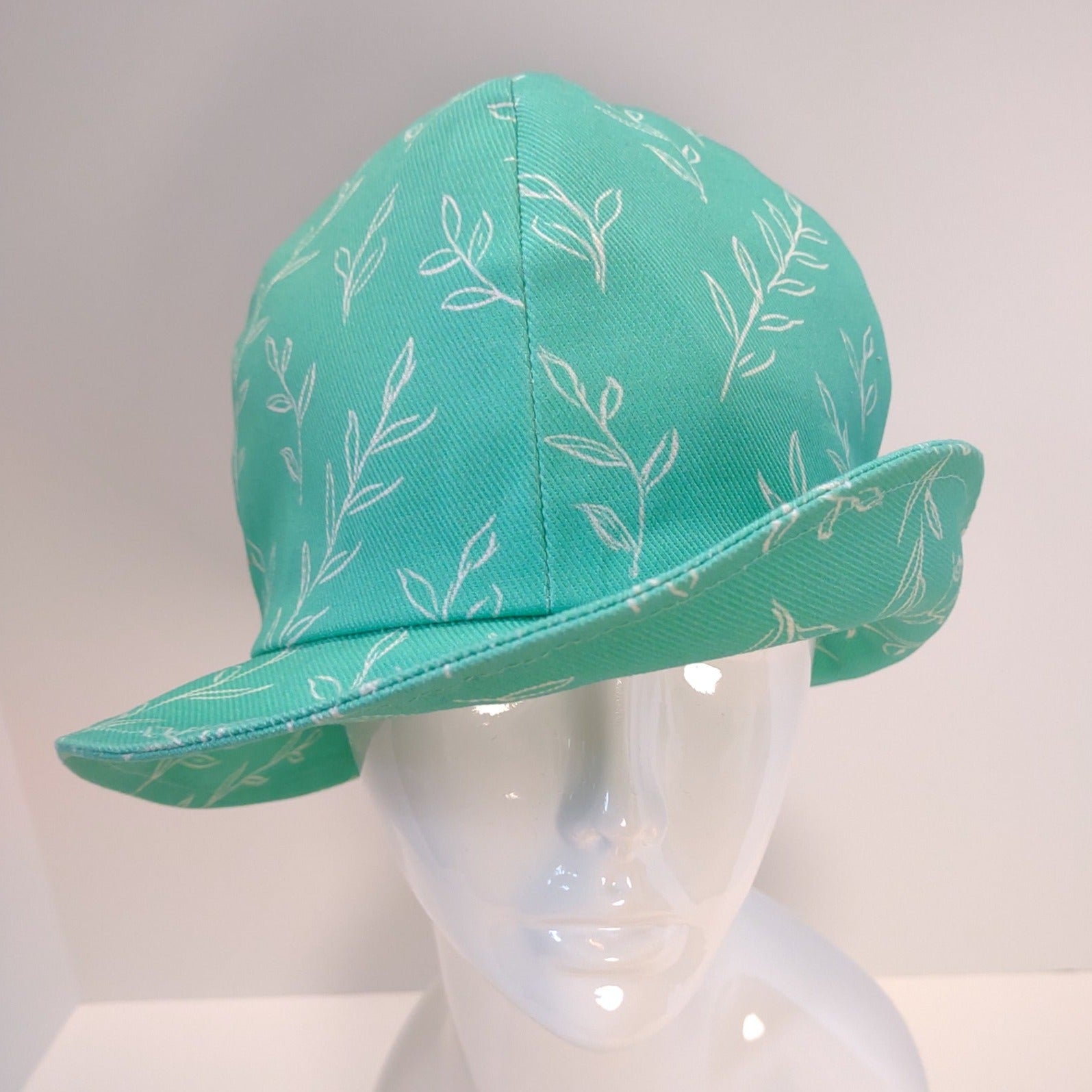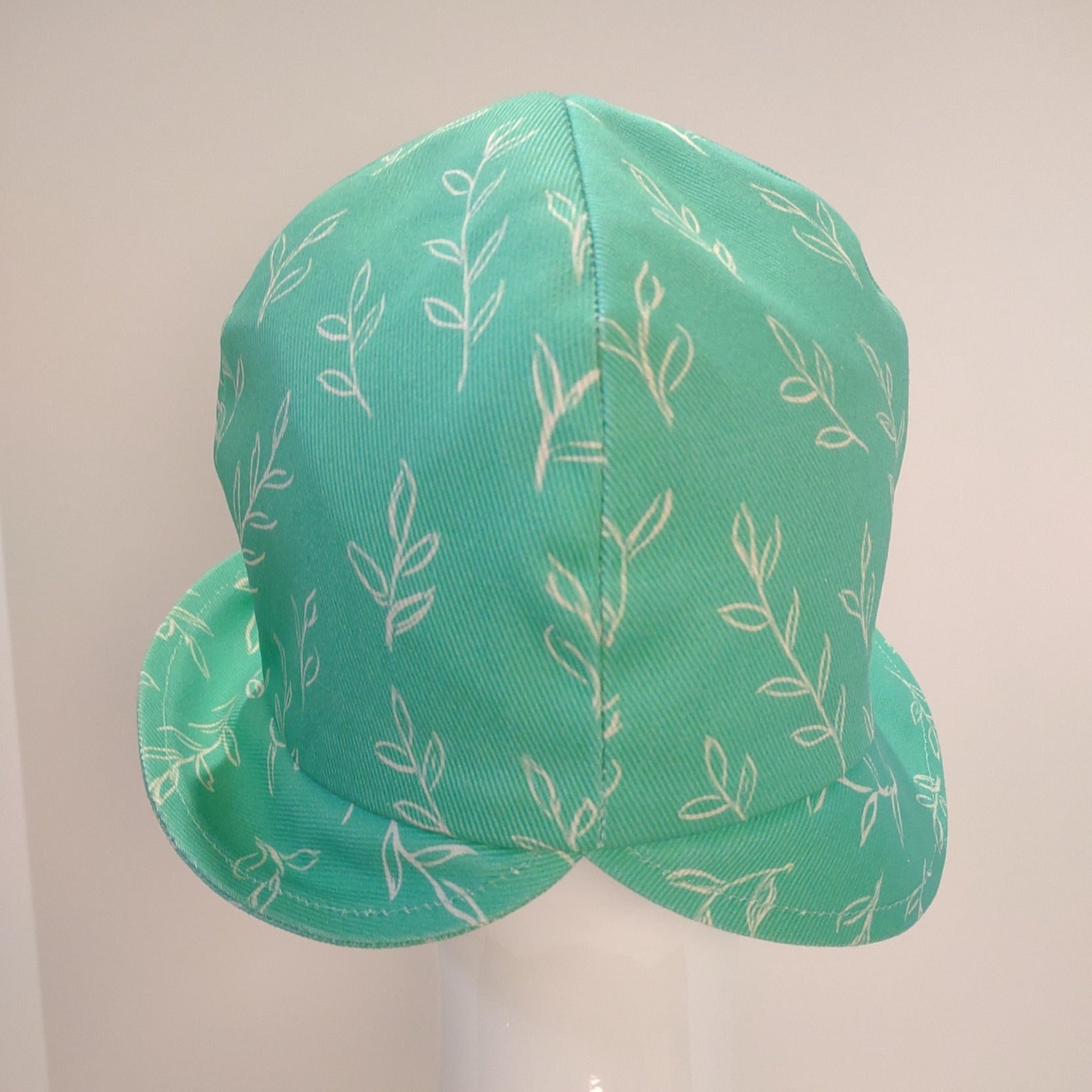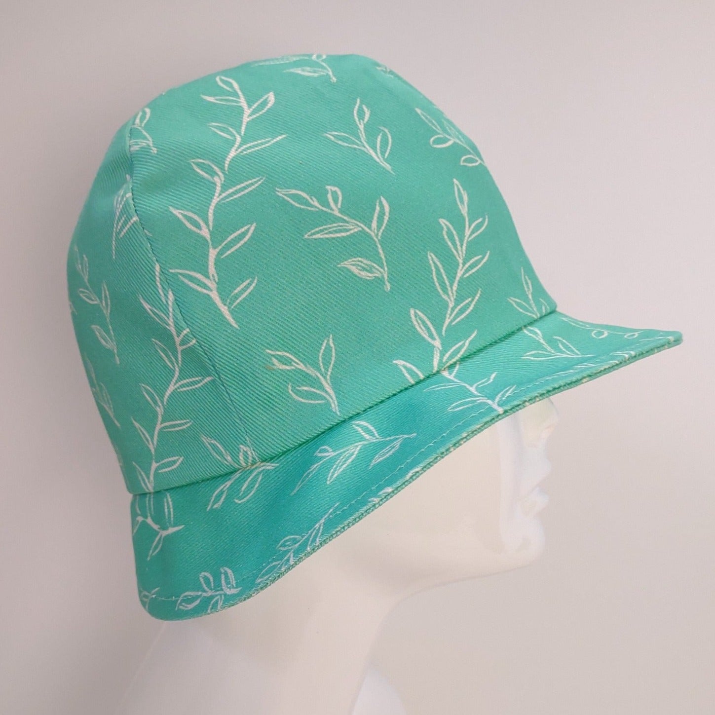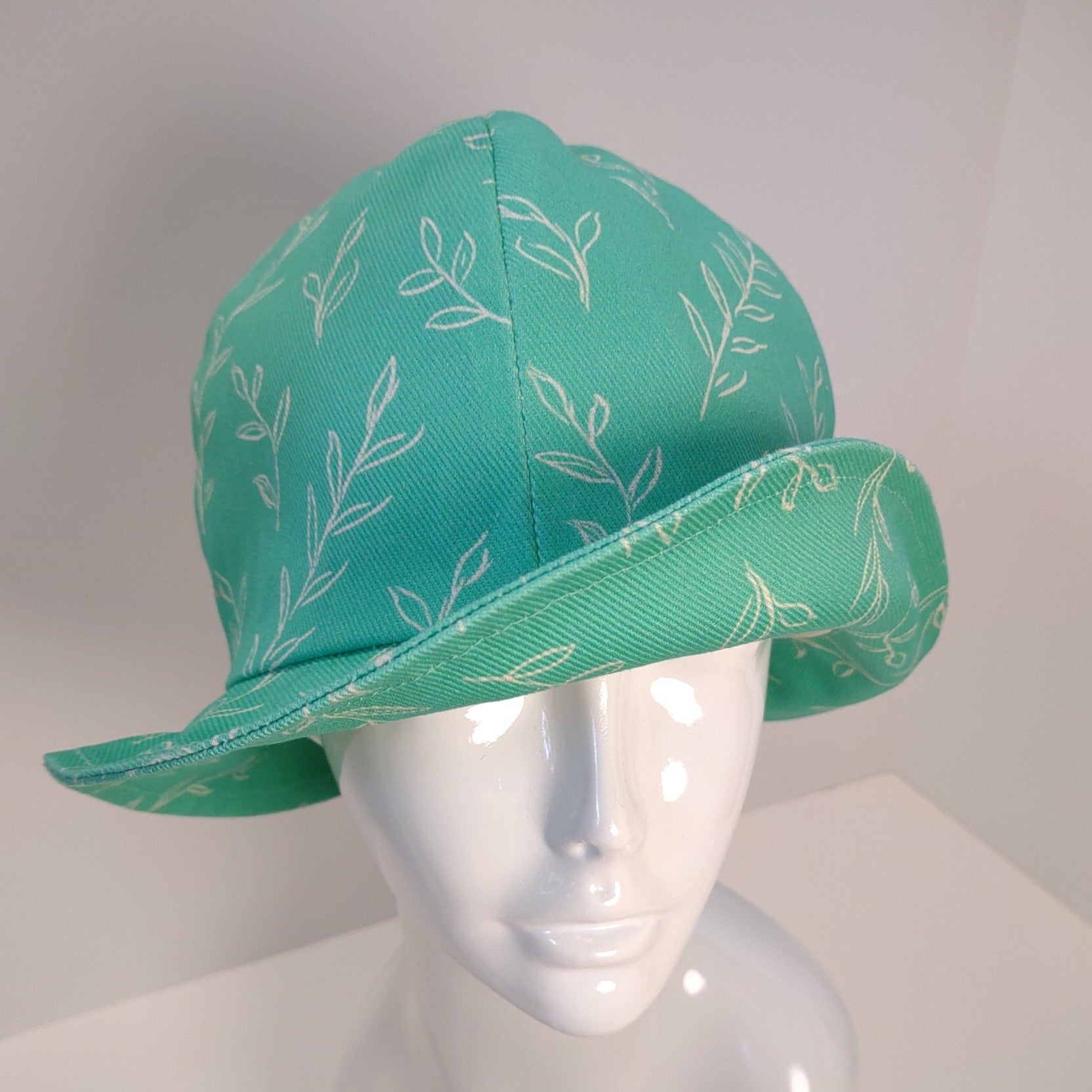 The Springy cloche is another hat that showcases fabric designed by Deborah Renville, owner of Palmer Adams Millinery. The hand-sketched leafy motif features Pantone colors of Mint Cold Green and New Market Sausage. The shell is in dogwood denim and the lining, in reverse colors, is premium cotton.