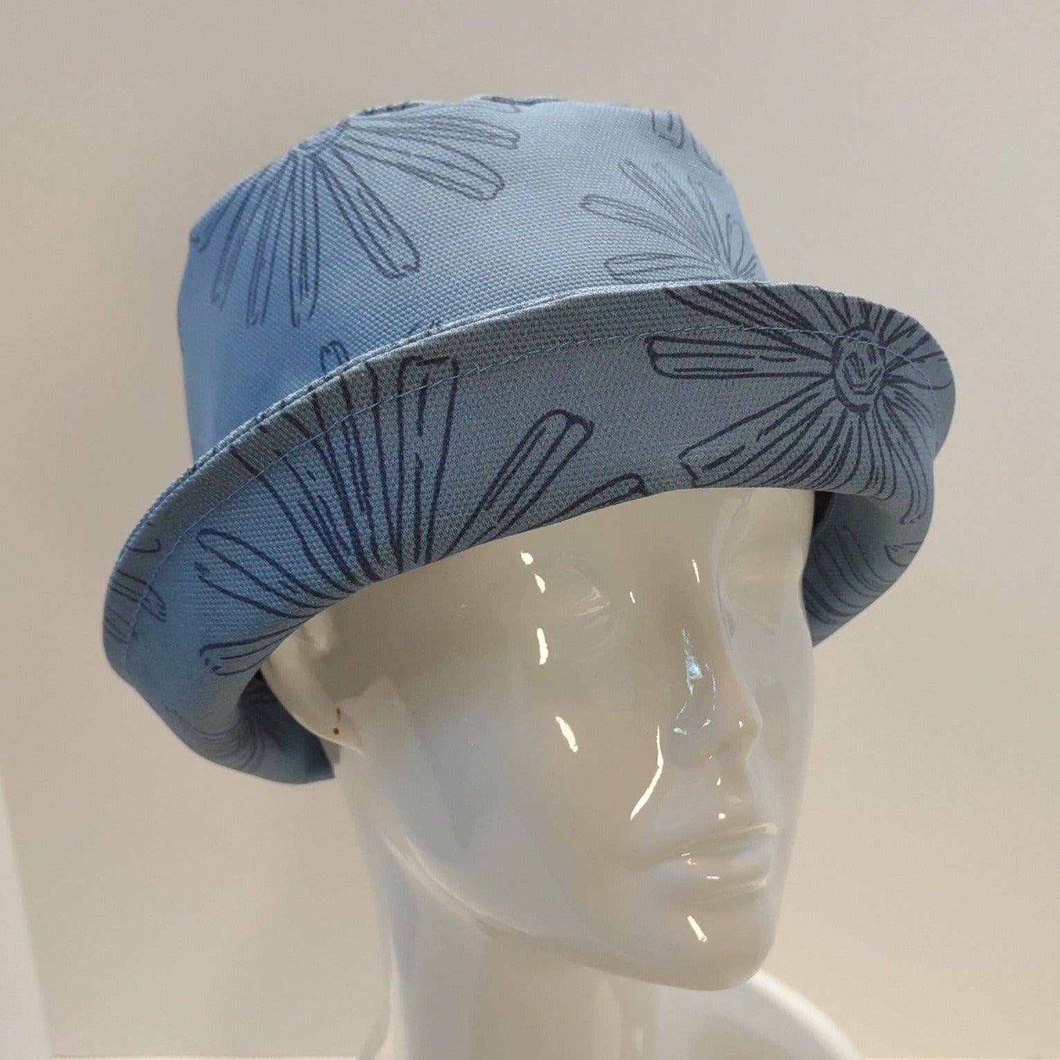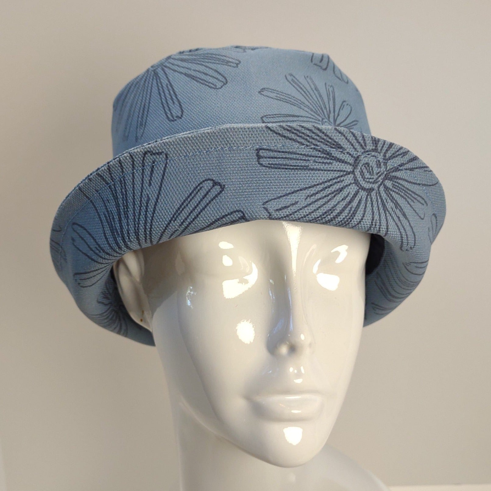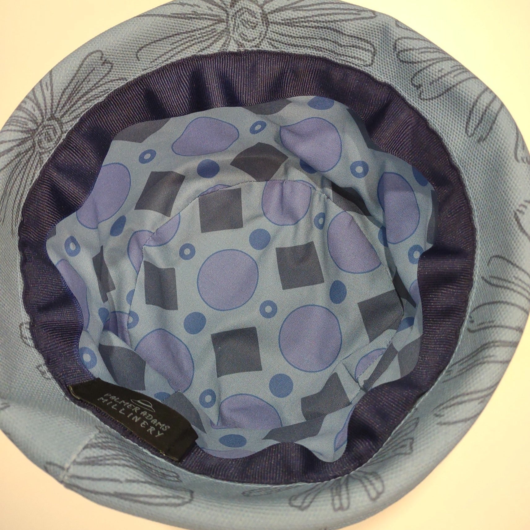 This hand-sketched design pays tribute to our love for denim. Breezy is another hat that showcases fabrics designed by Deborah Renville, owner of Palmer Adams Millinery. The hand-sketched floral motif features Pantone Denim colors. The shell is cotton canvas, and the premium cotton lining is a fabric titled Geometrical Medley in Denim.